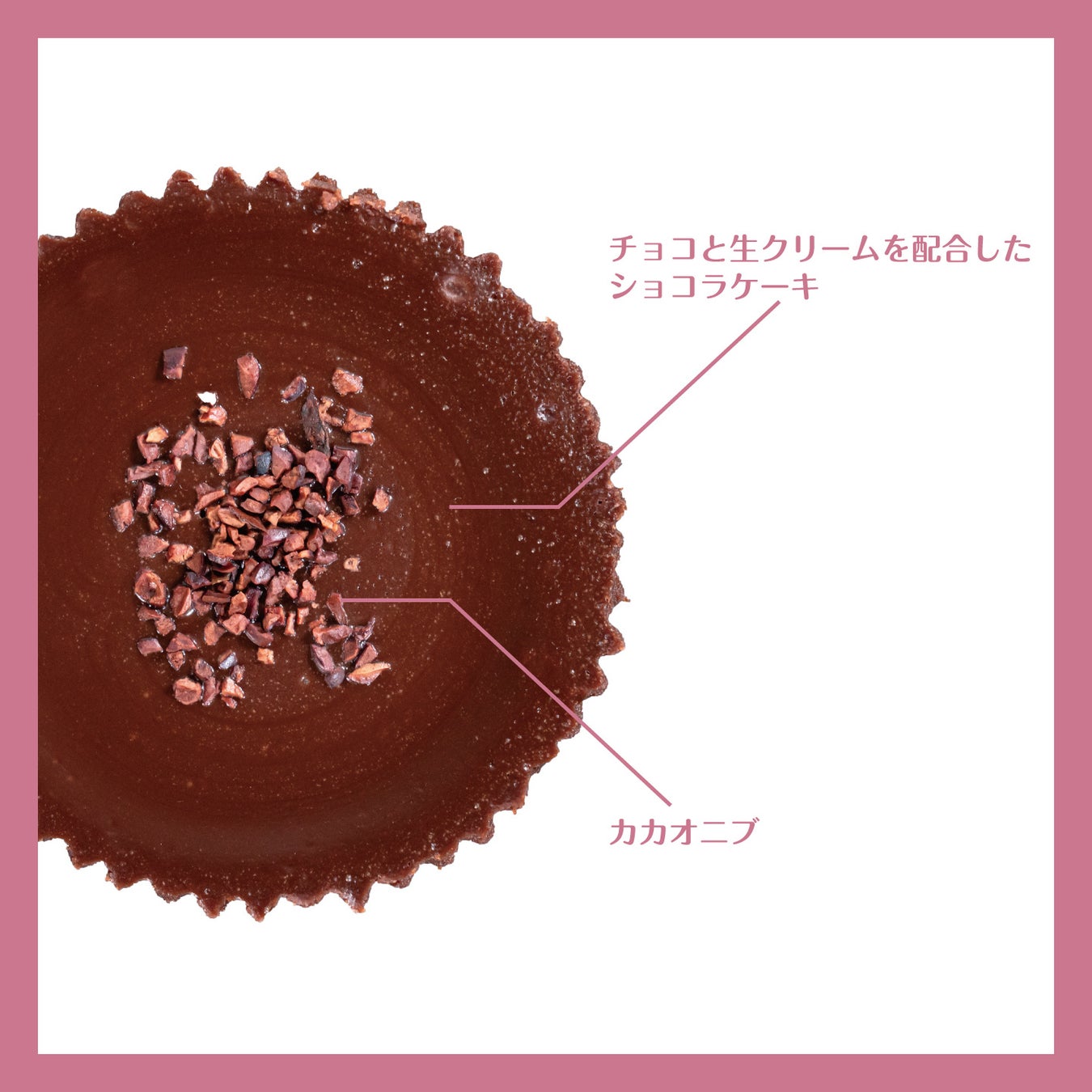 【内容】しっとり濃厚なチョコレートバウムの上にチョコレートをコーティングし、ナッツとクランチをかけました。さらに中央に生チョコを使用したなめらかなクリームを入れました。