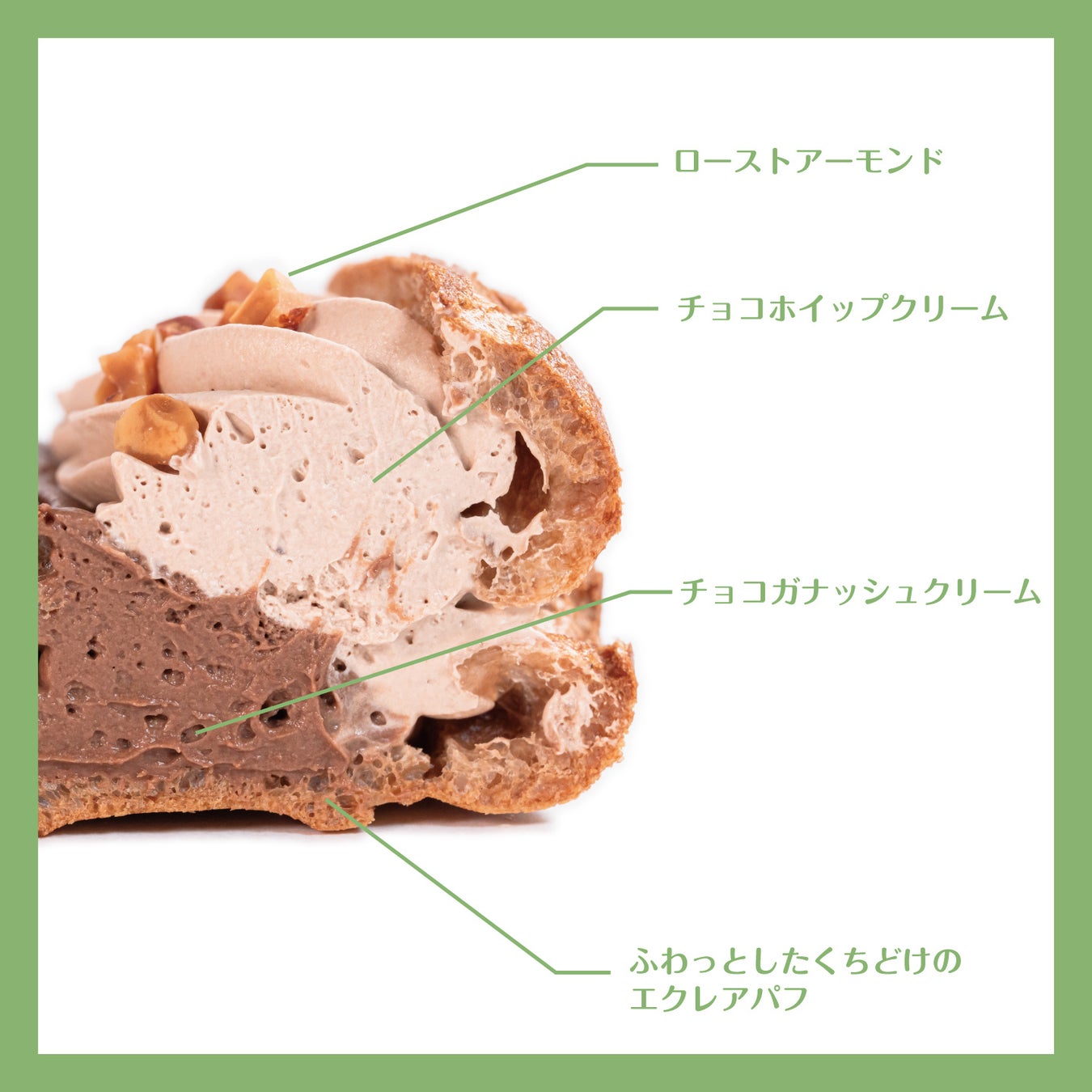 【内容】ふわっとしたくちどけの良いシューパフに、チョコホイップと濃厚なチョコガナッシュクリームをはさみました。