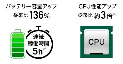 バッテリーは連続稼働時間が約5時間(※1)と、従来機の約1.3倍に。CPU等の見直しにより処理機能も大幅に向上させ、AnTuTuスコア換算で約3倍(※2)に性能強化しました。