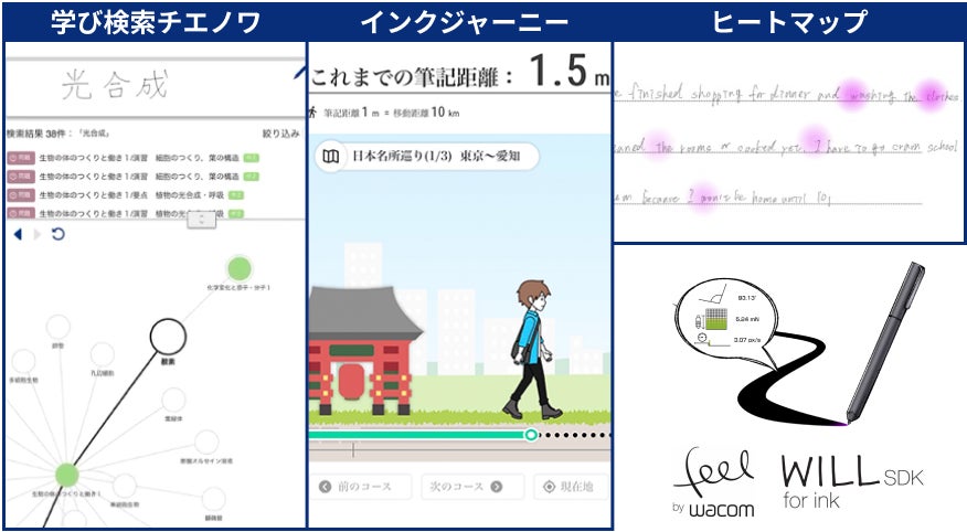 ワコムのWILL™テクノロジー(※6)によるデジタルインク情報を活用した筆記量の振り返り機能(インクジャーニー)や、記述に時間をかけた箇所がわかるリプレイ・ヒートマップ機能など、デジタルならではの新しい「書く学び」を実現しています。