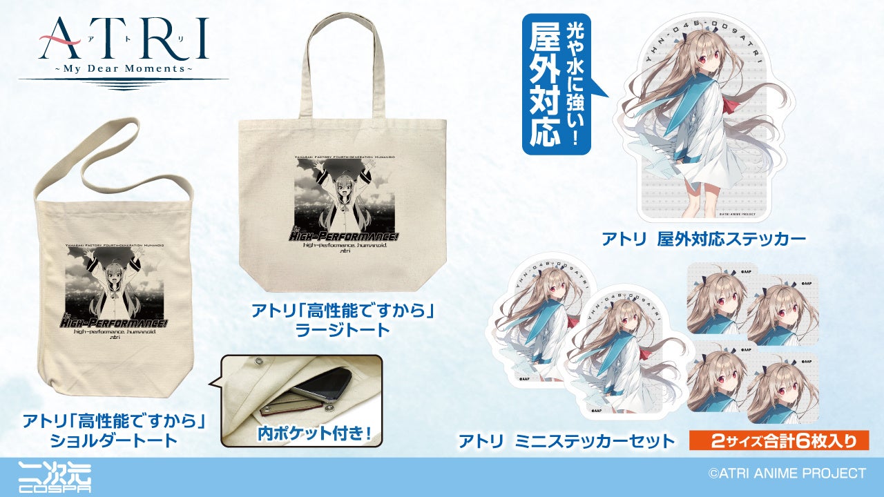 アニメ「ATRI -My Dear Moments-」より、「アトリ」のフルグラフィックTシャツやアクリルつままれ、「高性能ですから」Tシャツ、トートバッグなどが登場!【株式会社コスパ】