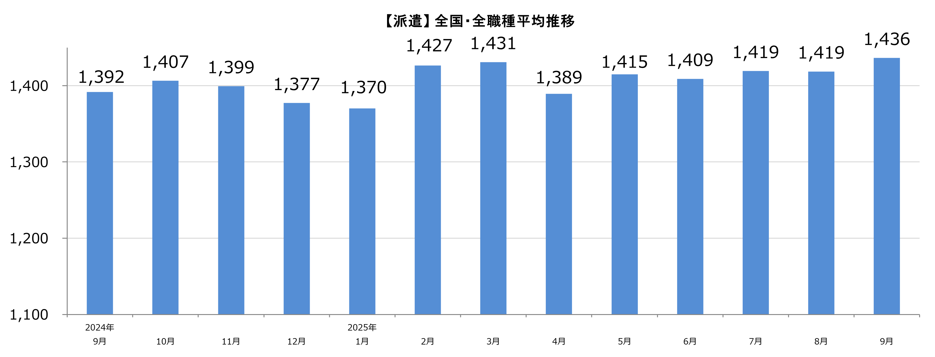 【派遣】全国・全職種平均時給は1,436円。前月比+17円。前年同月比+44円。