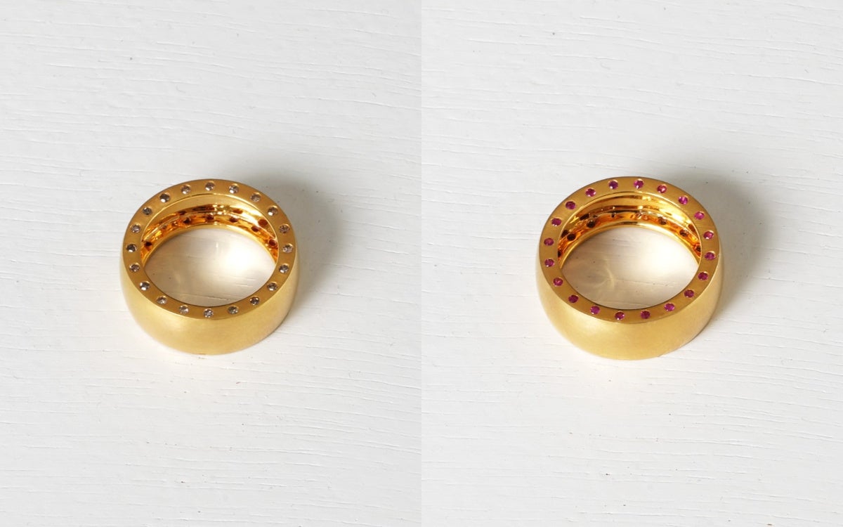 リングの厚み幅の部分に、片面はブラウンダイヤモンド、もう片面はルビーを円に連なるよう20粒配した印象的でボリューミーなリング。凛とした美しさのブラウンダイヤモンドと華やかさのある深いレッドのルビー。上下の着け方次第で自由にスタイリングが可能なリバーシブルリングです。地金部分は、艶とマットの間にあたる、ダルポリッシュ加工といわれるインドならではの加工が施され、オリエンタルな風合いに。<リバーシブル リング ¥44,000 (SILVER925+K18plating / ダイヤモンド、ルビー)>