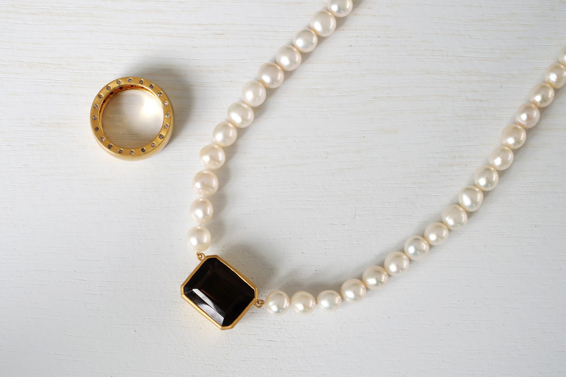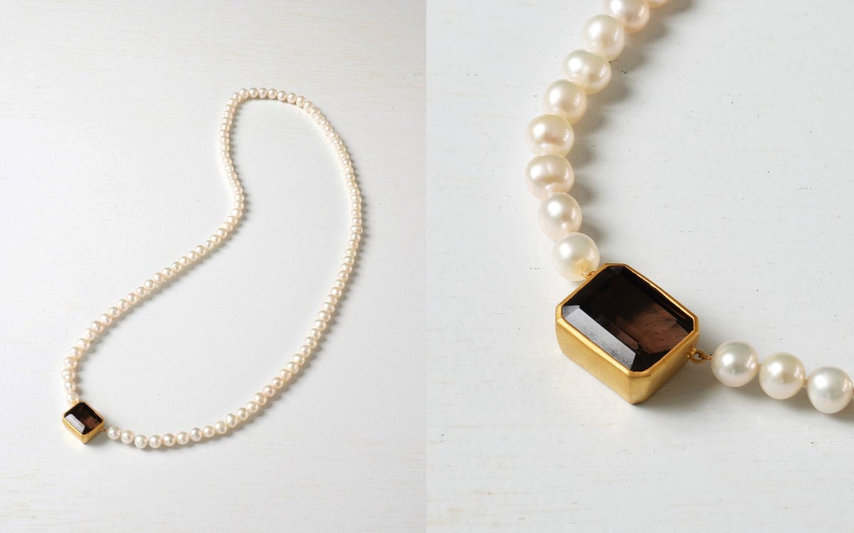 第一弾となるコレクションは、インド・ジャイプールの地で、熟練の職人により制作されたリバーシブルのボリュームリングと、スモーキクォーツをあしらったパールネックレスの2型。