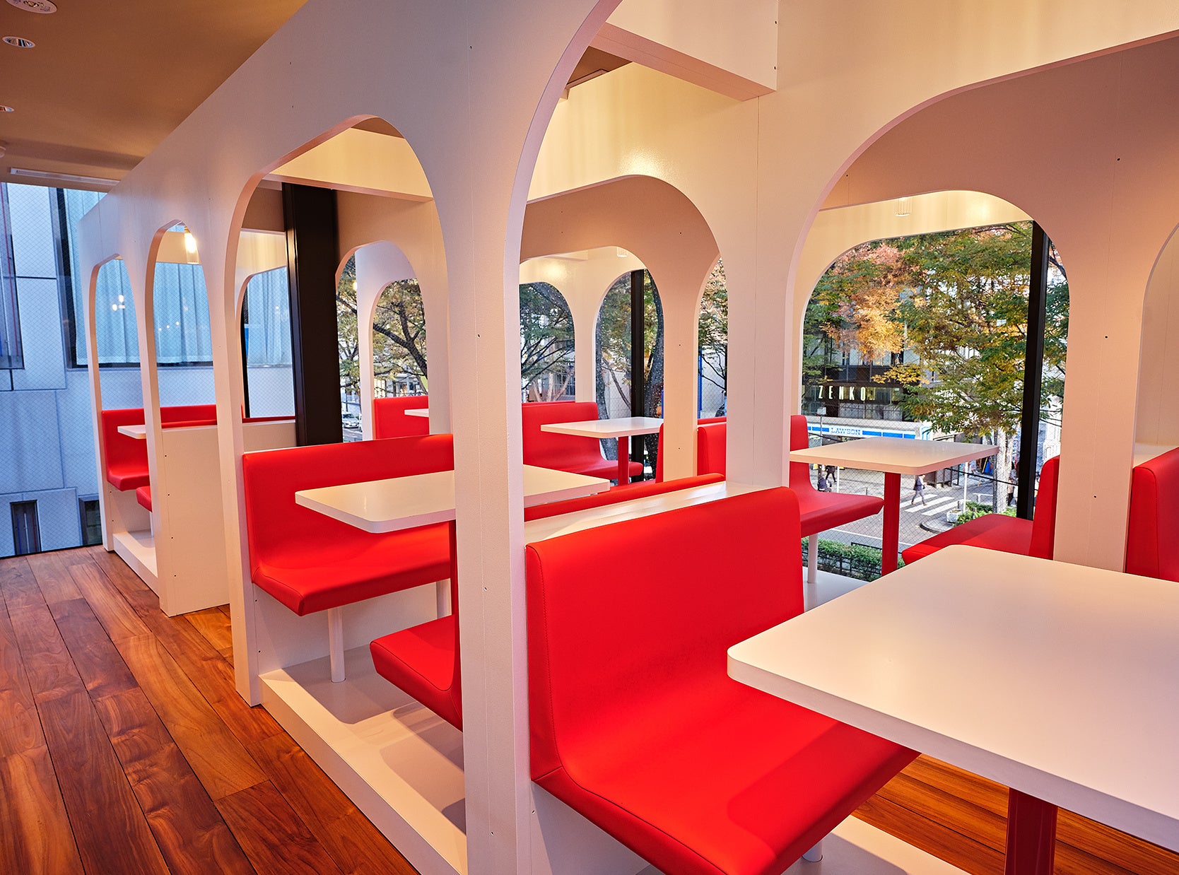 2 階では、店内で焼き上げるパンやドーナツを提供する「VAT BAKERY」と、オリジナルメニューのドリンクやベーカリーで購入したパンなどを楽しめるカフェスペースを展開します。カフェスペースは、東京・神田で多くの人に愛された純喫茶の名店「エース」の家具を引き継いだフロアとノスタルジックなデザインの赤いボックスシートが特徴で、「V.A.」ならではの空間と飲食を楽しむことができます。