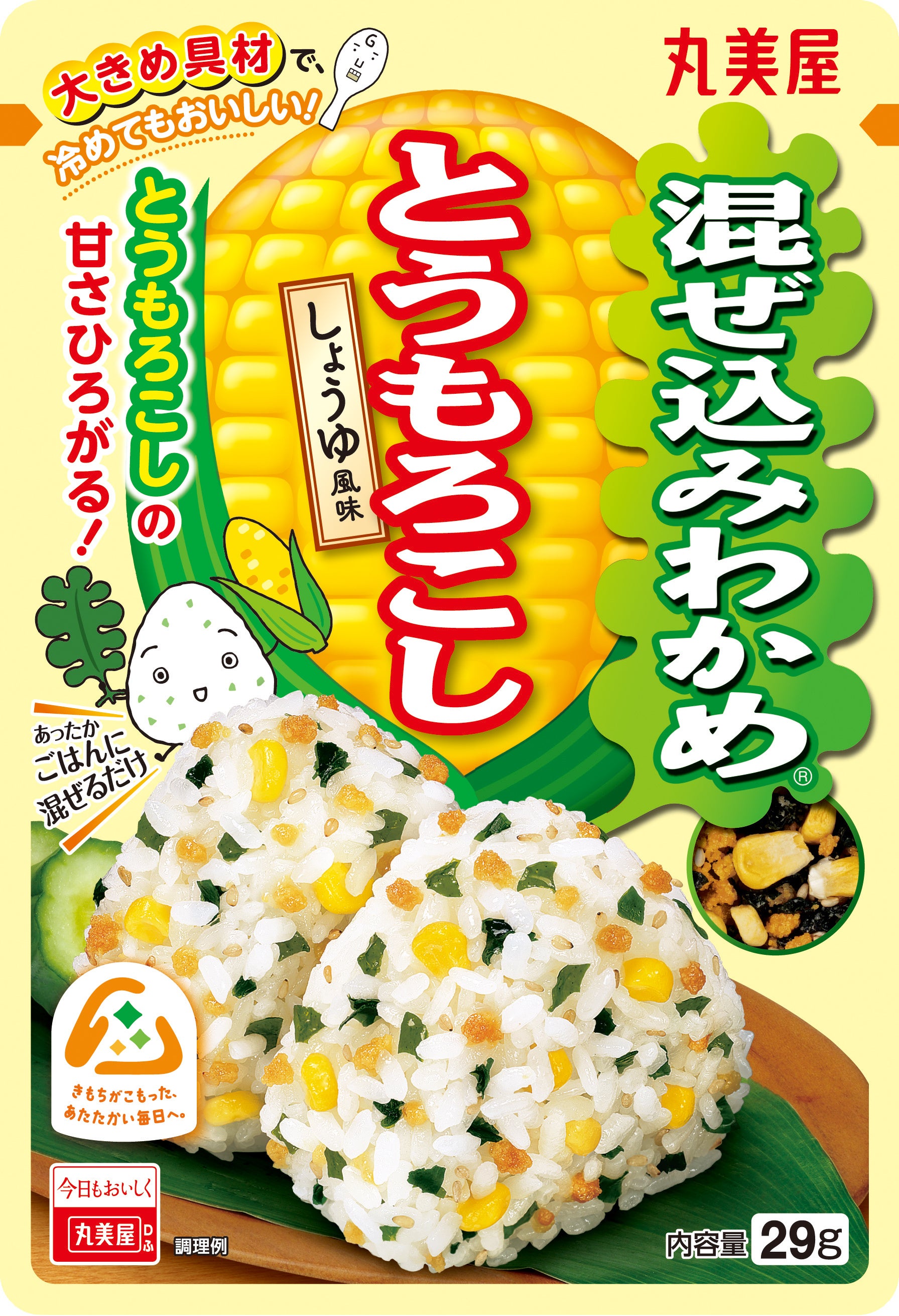 わかめにとうもろこし具材と白胡麻を合わせ、ほんのり醤油味で仕上げました。とうもろこし具材の黄色で彩り豊かなお弁当やおにぎりを作れます。