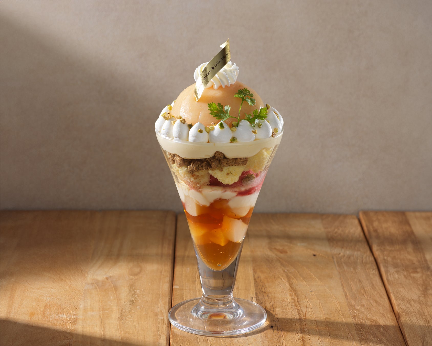 まんまるの桃を贅沢にのせた、桃が主役のパルフェ。優しく香る紅茶のジュレや酸味のあるベリーアイスを 合わせることで、最後まで飽きずに楽しめる一品に仕上げました。