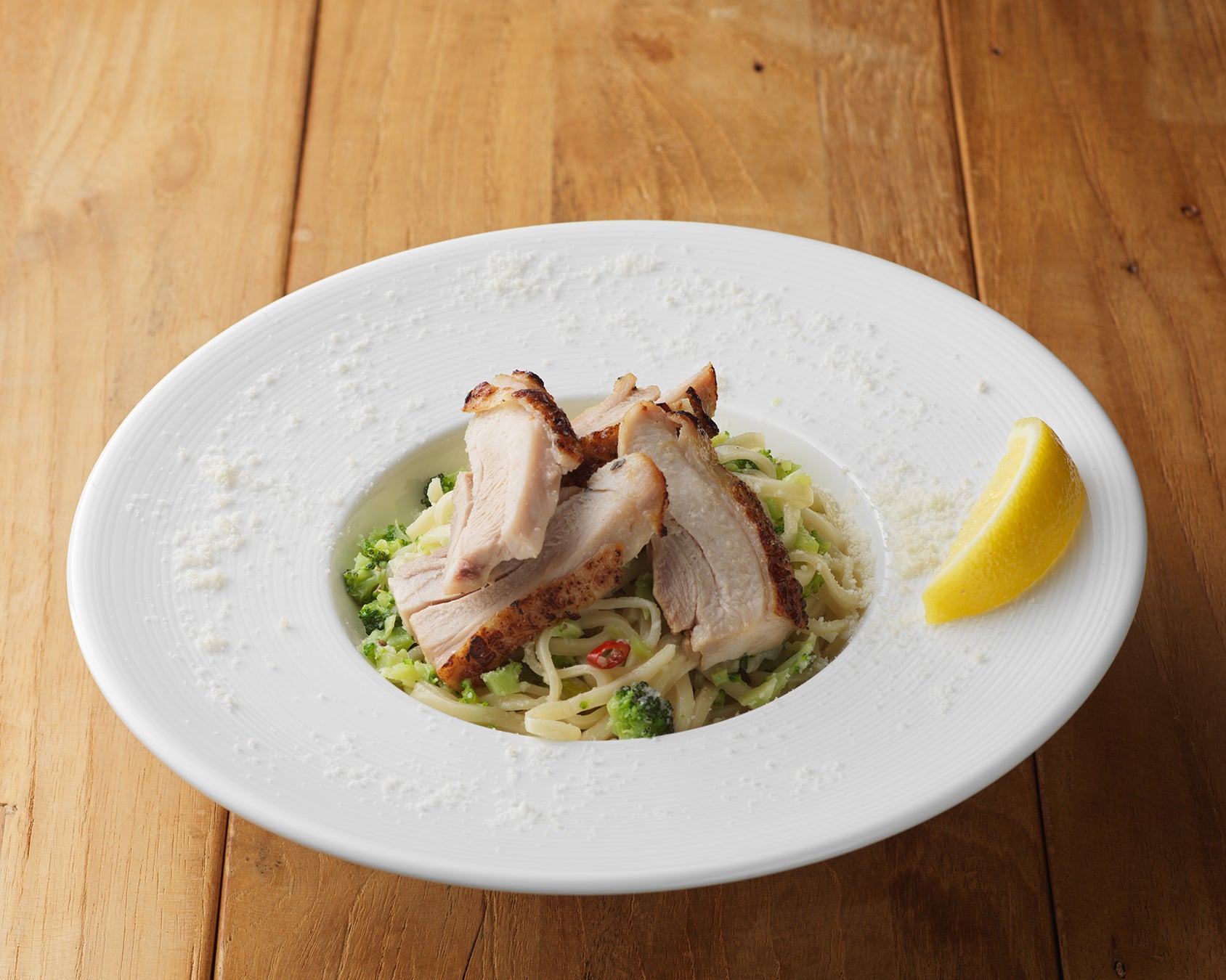 肉の旨みが広がる「北海道産鶏もも肉とブロッコリーのペペロンチーノ」