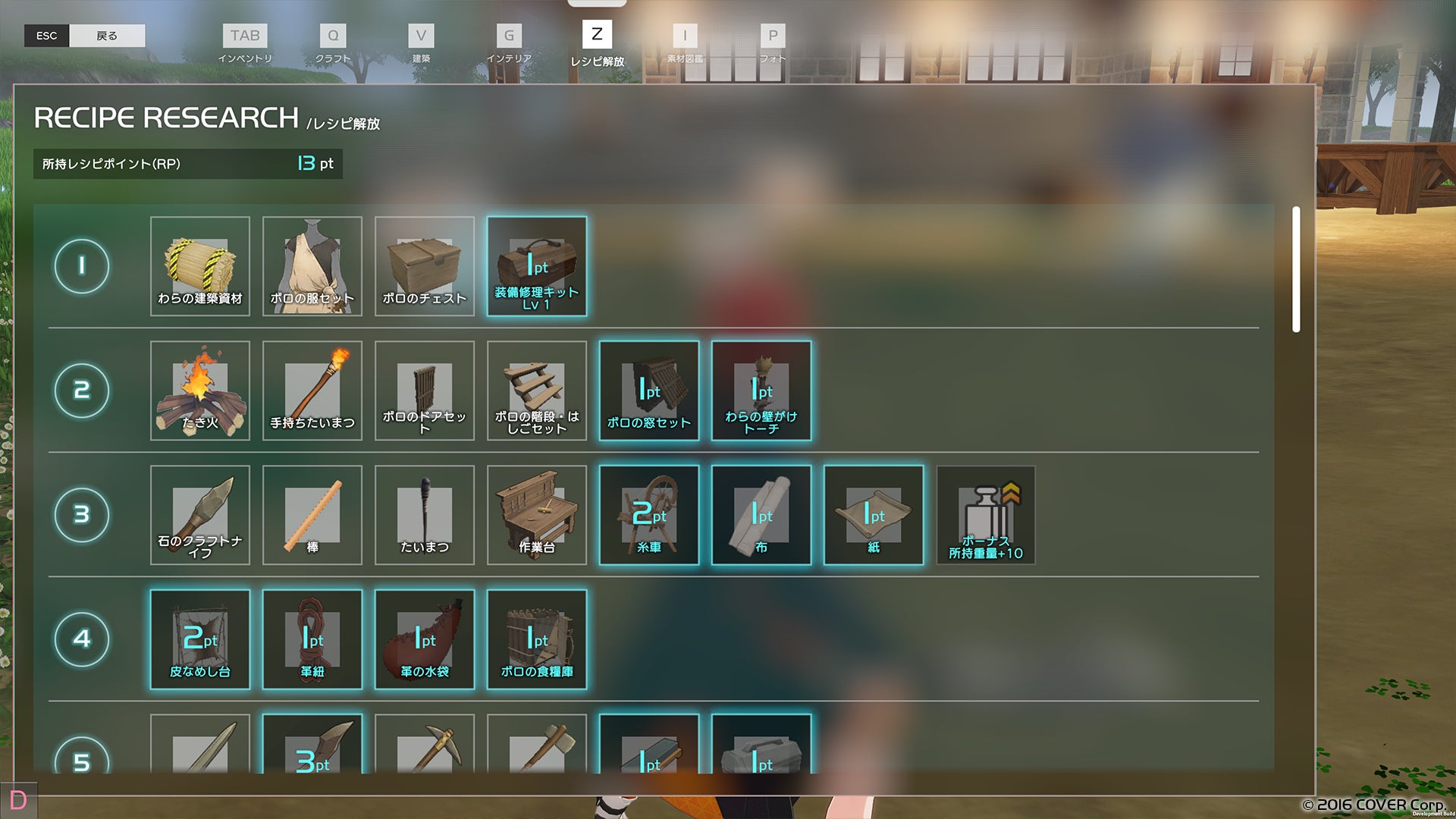 レシピは、レベルアップ時に取得できるレシピポイントを使用して解放できます。
