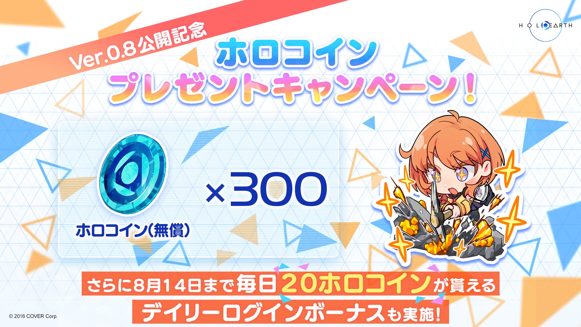 Ver.0.8の公開を記念して「300ホロコイン(無償)」と、8月14日までデイリーログインボーナスとして「20ホロコイン(無償)」をプレゼントさせていただきます!