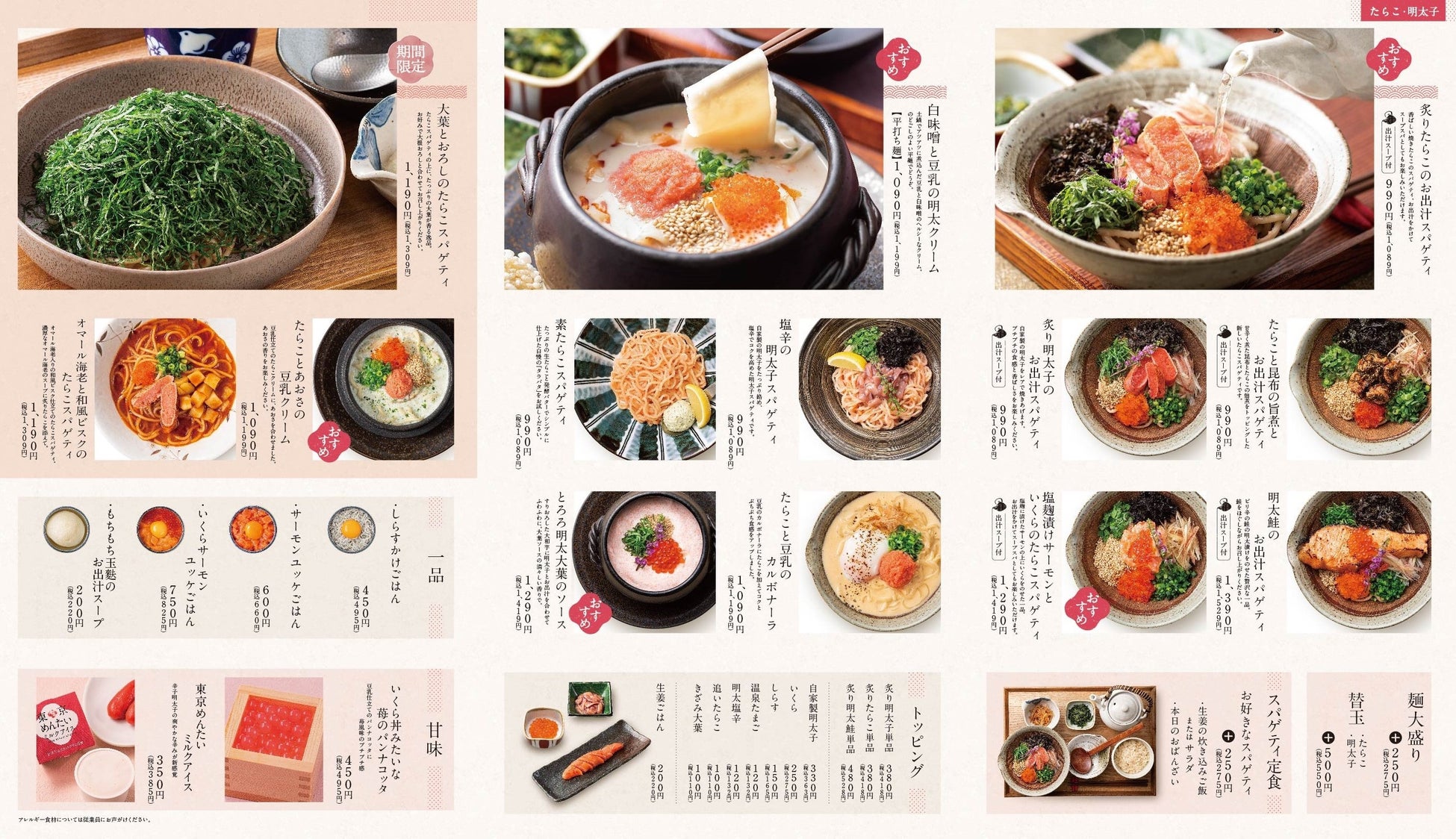 その他、濃厚なオマール海老のスープに炙りたらこを添えた「オマール海老と和風ビスクのたらこスパゲティ」や、豆乳仕立てのたらこクリームにあおさが香る「たらことあおさの豆乳クリーム」が加わり、春めく季節に選んでいただけるような進化系たらこスパゲティが仲間入りいたします。
