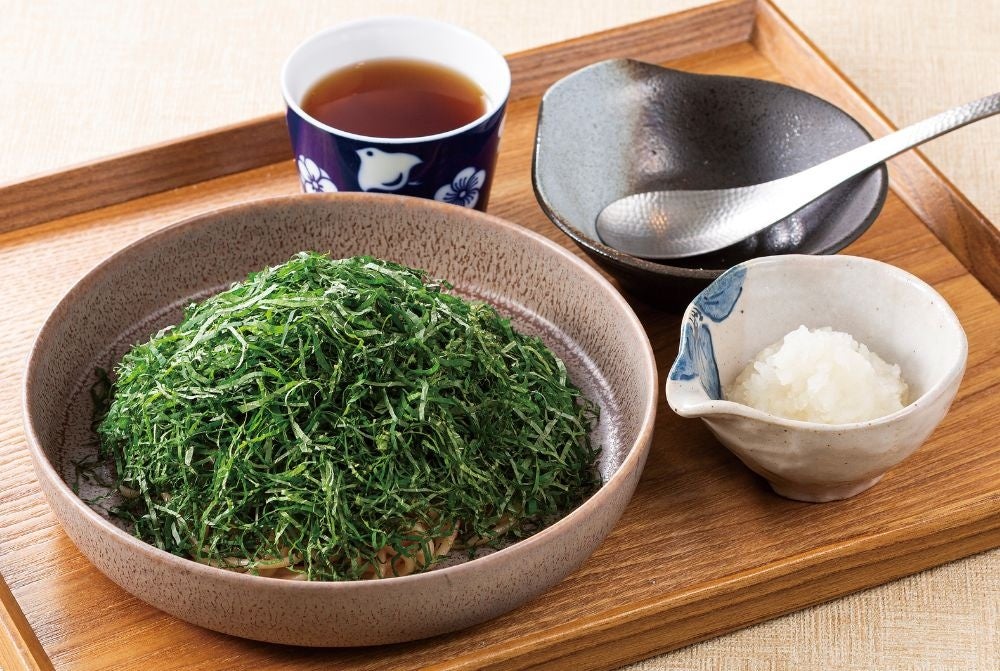 「大葉とおろしのたらこスパゲティ」の、たっぷりとたらこを絡めた、もちもちのたらこスパゲティが見えない程に盛りつけた千切りの大葉は約20枚分。見た目はもちろん口に運べば爽やかさが広がる進化系たらこスパゲティです。たらこスパゲティと大葉の間に潜むプチプチ食感のとびこがアクセントに。小鉢で添えた大根おろしと合わせる他、卓上の明太醤油など自分だけの味変も楽しめます。