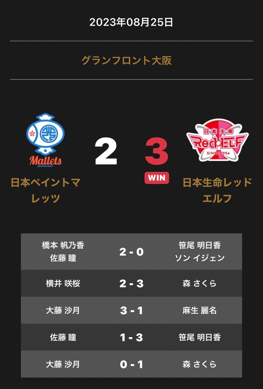 日本ペイントマレッツと日本生命レッドエルフの試合は2-3で日本生命レッドエルフが勝利しました。