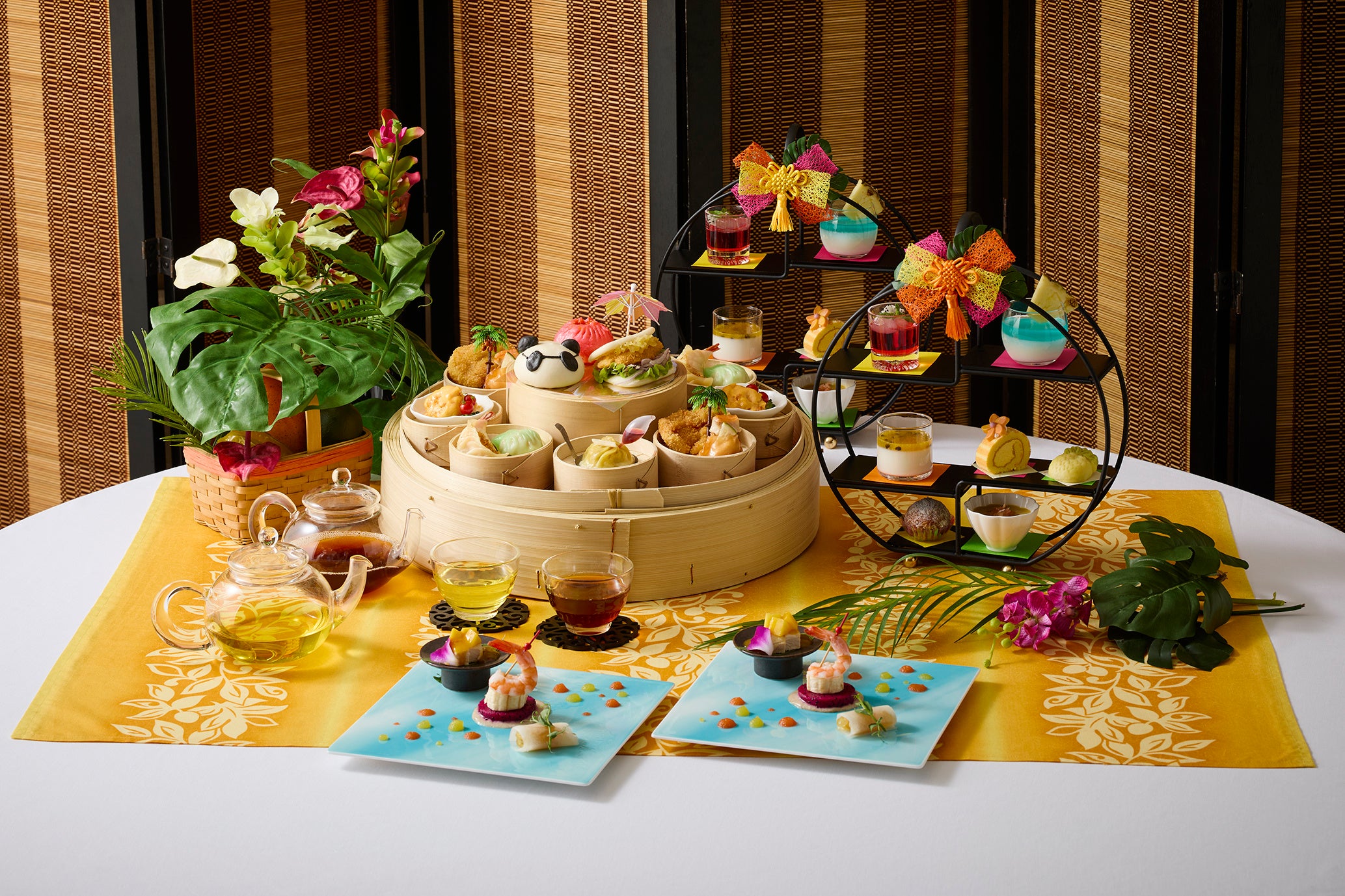 色鮮やかな南国フルーツのスイーツや食欲をそそるセイボリーが魅力の「トロピカルチャイニーズアフタヌーンティー」が登場。大きなセイロには、サングラス姿のパンダ饅頭やインパクト抜群の真っ赤な海老のチリソース饅頭、つぶつぶ食感のパイナップルが特徴のトロピカルソースで仕上げたフィッシュバーガーが中央に並びます。
