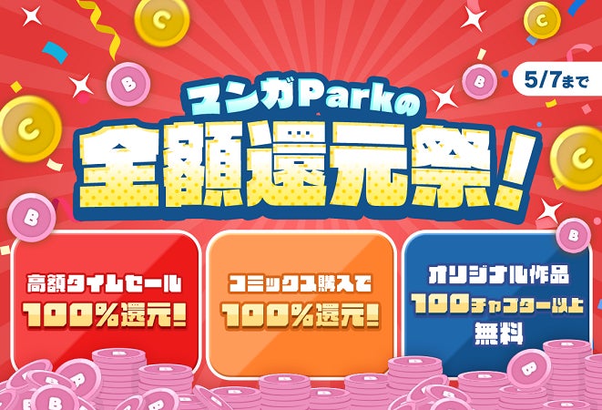 マンガParkおすすめのオリジナル作品が100チャプター以上無料で読めるほか、コインやコミックスの購入でお得なコインバックキャンペーンも実施! 3つのお得な「100」で、GWはマンガ沼!