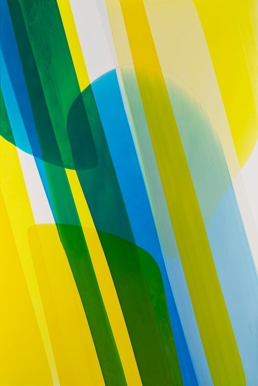 中島麦は京都市立芸術大学を卒業後、現在大阪を拠点に制作活動を続けています。絵画を構成する要素の中でも「動き・奥行き・光」の3つを探求しながら抽象画を手掛けています。近年は、そこに「時間」を表現する試みを行っています。制作過程では筆を使わず、傾け固定したキャンバスに、ビーカーでゆるく溶いたアクリル絵具をゆっくりと流し描きます。重力により滑り落ちていく絵具の物質的な動きを操り、時にはキャンバスを回転させながら、時間をかけて画面上に定着させていきます。絵具を流し、乾かし、さらに別の色を流すという工程を繰り返すことで、いくつもの重力軌道とレイヤーの重なりによる多様な表情を生み出します。
