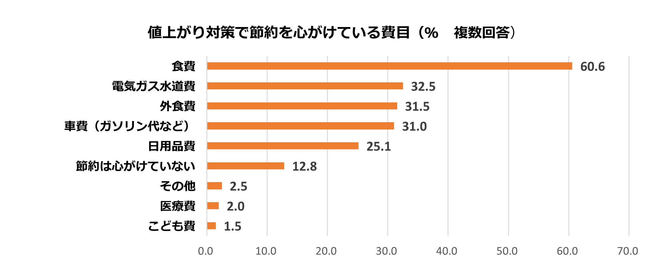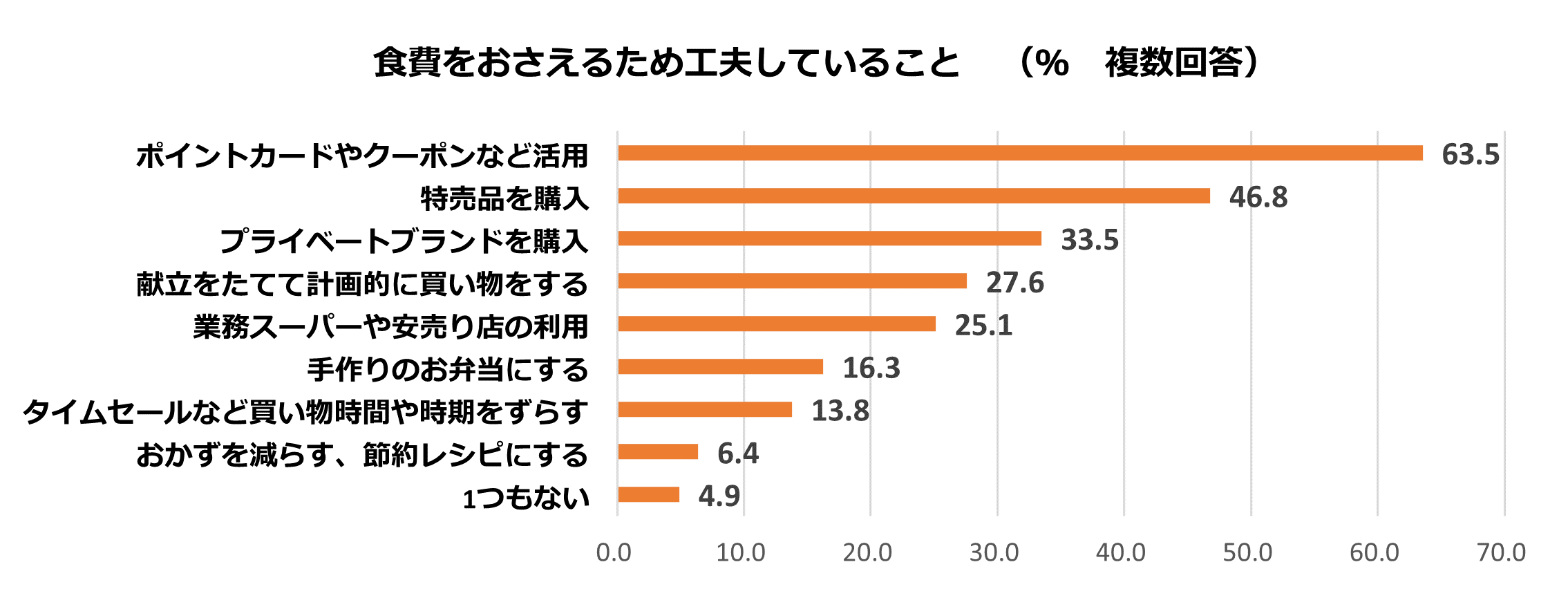 ②値上げ対策1位は、食費をおさえる。ポイントやクーポン利用のほか献立をたてるなどでも対策
