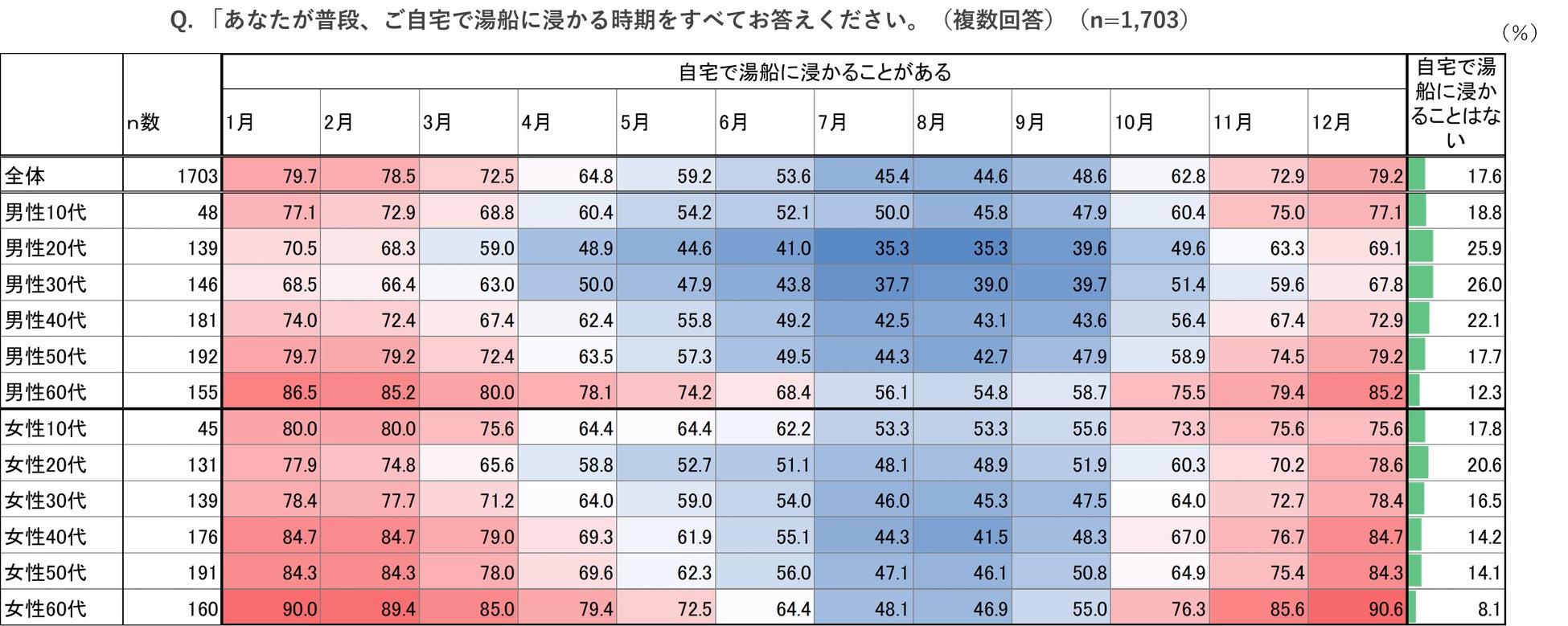 湯船に浸かる時期について、全体では1月~3月や11月~12月など、寒い時期になると7割を超え、7月~9月の暑い時期には5割を切っていることが明らかになりました。また、時期に関係なく、「自宅で湯船に浸かることはない」と回答した人は17.6%という結果でした。