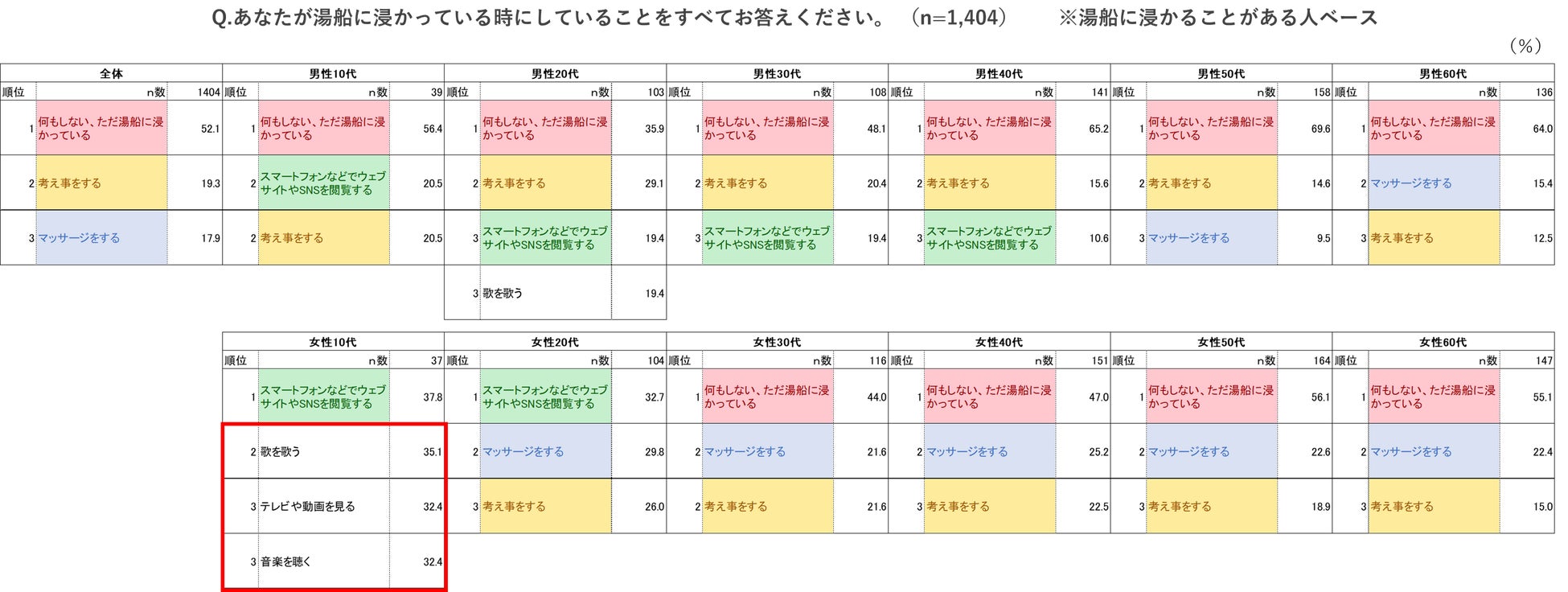 10代女性では「歌を歌う」「テレビや動画を見る」「音楽を聴く」といった行動も上位にきており、入浴時間を楽しんでいる人も多いようです。