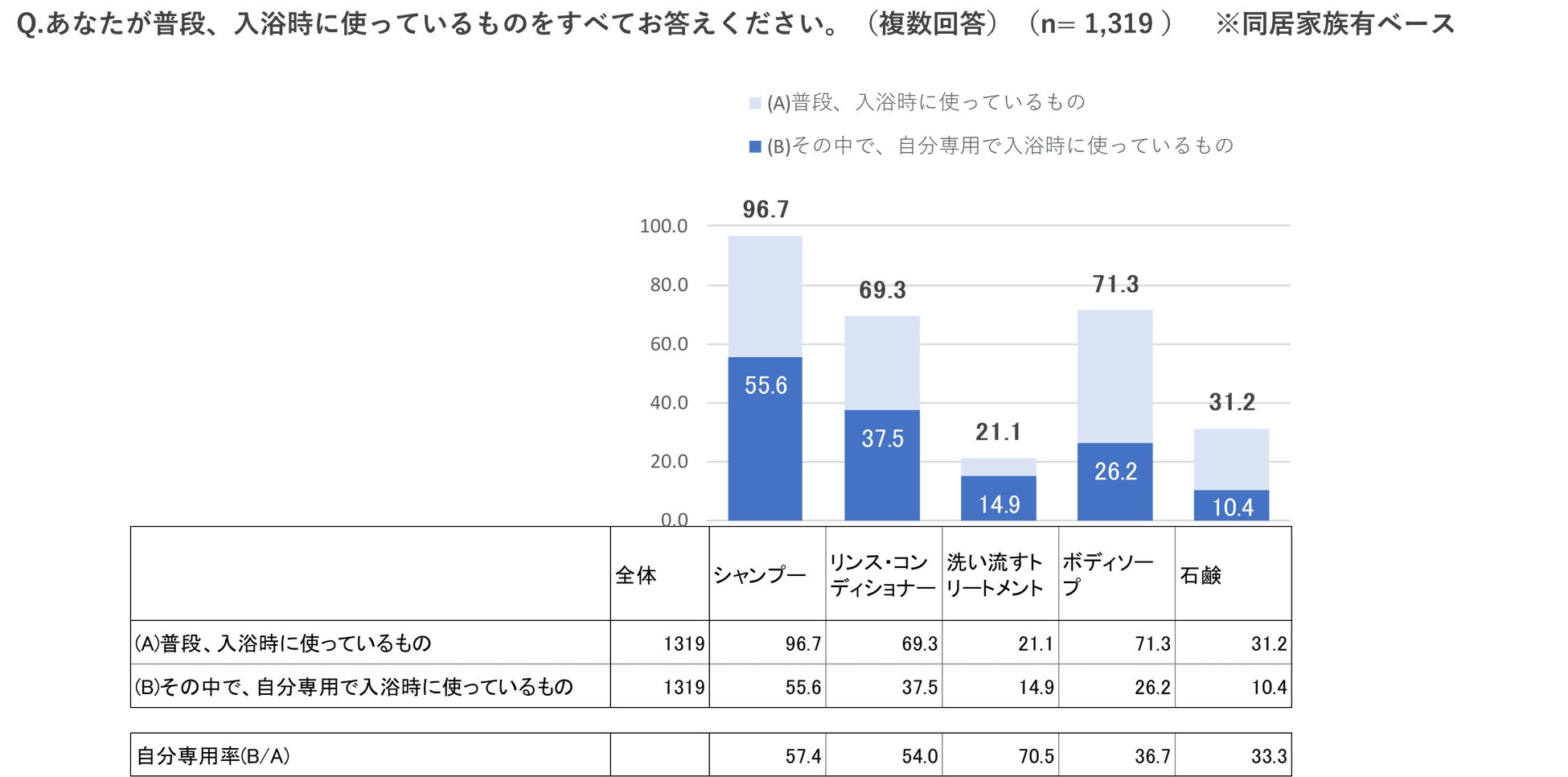「同居家族有り」の人に限定し、一部の日用品について「普段、入浴時に使っているもの」と「そのなかで、自分専用で入浴時に使っているもの」を見たところ、以下のような結果となりました。
