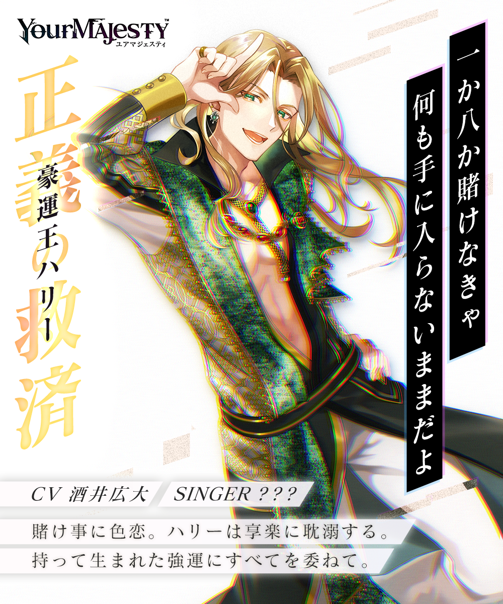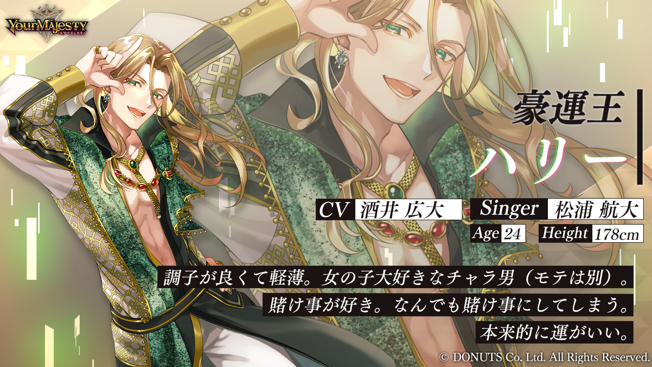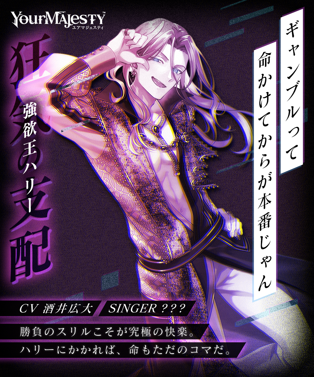 株式会社DONUTS(本社:東京都渋谷区、代表取締役:西村啓成、以下DONUTS)が企画する「正義」と「狂気」の物語『ユアマジェスティ』は、酒井広大がCVを担当する【豪運王 / 強欲王:ハリー】の新キャラクターソング「Welcome to the Gamble Night」のMVをYouTubeにて公開いたしました。ハリーのシンガーには圧倒的な歌唱力を武器にテレビやYouTubeなどで活躍する松浦航大を起用いたします。
