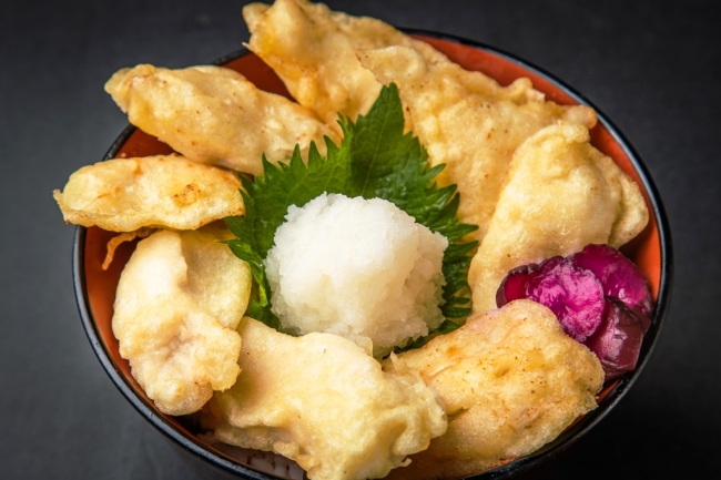 大分県民熱愛フードの一つが「とり天」。鶏肉を特製のタレに漬け込み下味をしっかりと付けて揚げた天ぷらを、丼一面ぐるりと囲むようにたっぷり盛りつけました。一見ボリューミーですが、消化酵素も豊富な大根おろしを合わせることで、あっさり&さっぱりとお楽しみいただけます。
