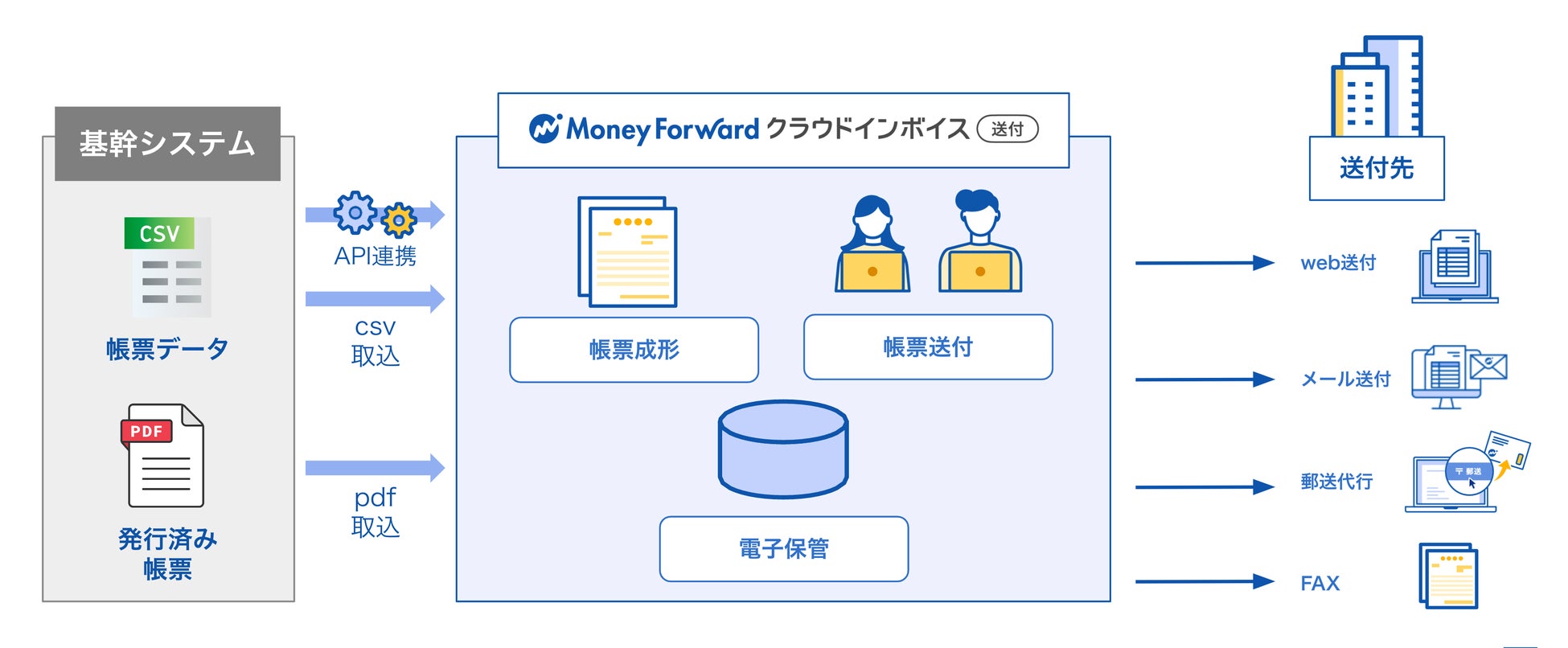 取引に関わる全ての帳票の送付業務をクラウド上で完結することができます。また、インボイスの発行控えを、電子帳簿保存法に則って、電子保管することも可能です。送付業務の課題に特化して導入ができる他、他社の請求関連サービスやすでに導入済の基幹システムと組み合わせた利用ができます。