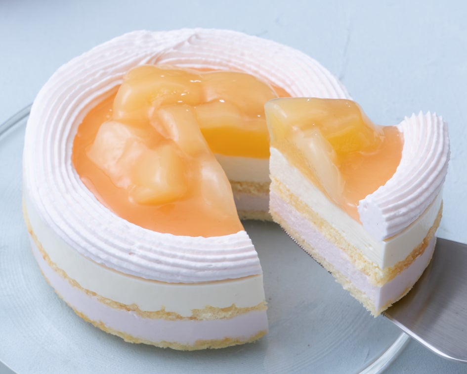 白桃とライチの爽やかな甘さとマスカルポーネチーズのミルキーな甘さがなめらかに広がる2層のムースケーキ。天面のジュレやクリーム、中のムースに至るまで感じられる白桃の味わいに、チーズのほどよい酸味とライチの華やかな風味が相性抜群です。天面のごろりとした“恋香桃”のジューシーな果肉感とともにご堪能ください。