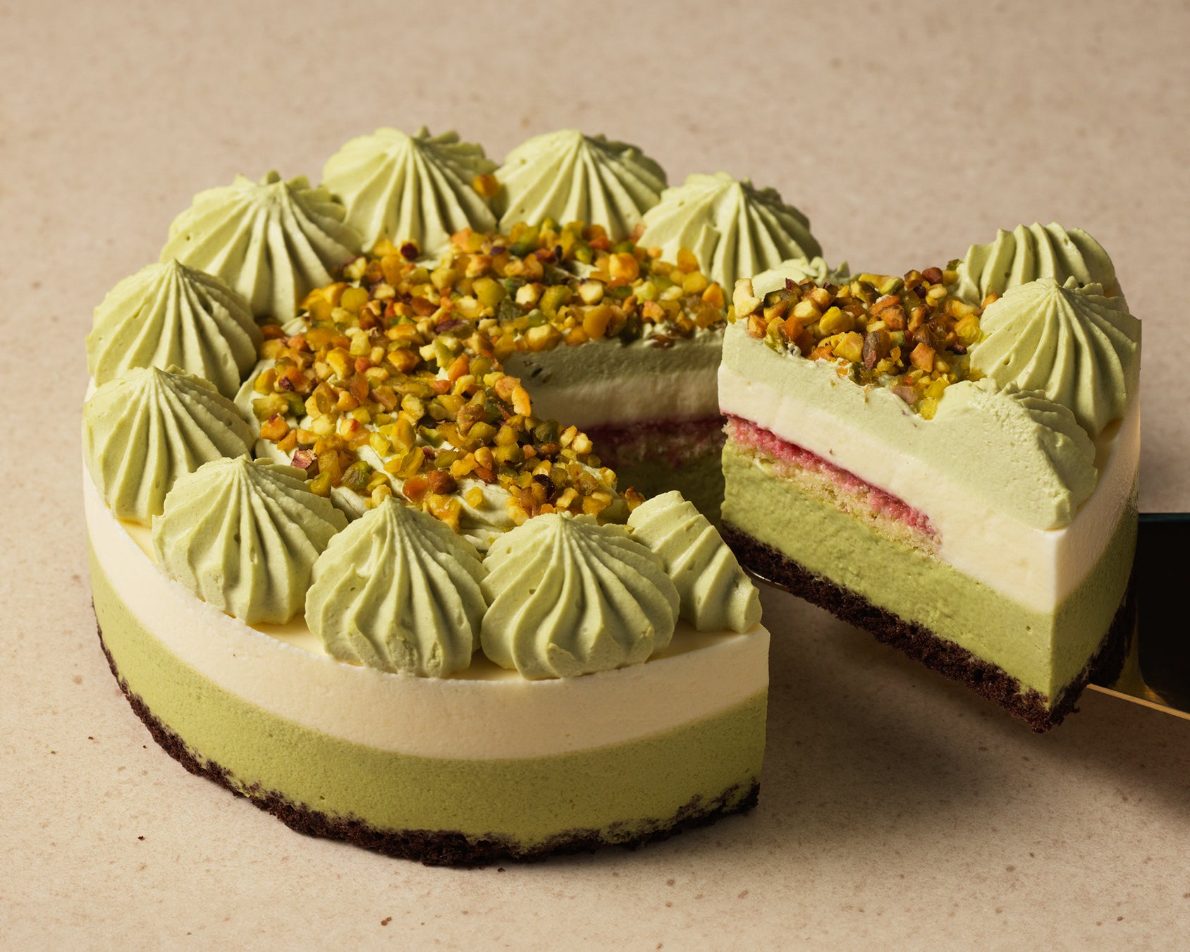 香ばしくローストしたピスタチオを天面に敷き詰め、2種のピスタチオペーストを使ったムースにイタリア産マスカルポーネのムースを重ねました。中にはフランボワーズをしのばせ爽やかな酸味がナッツの風味を引き立てます。