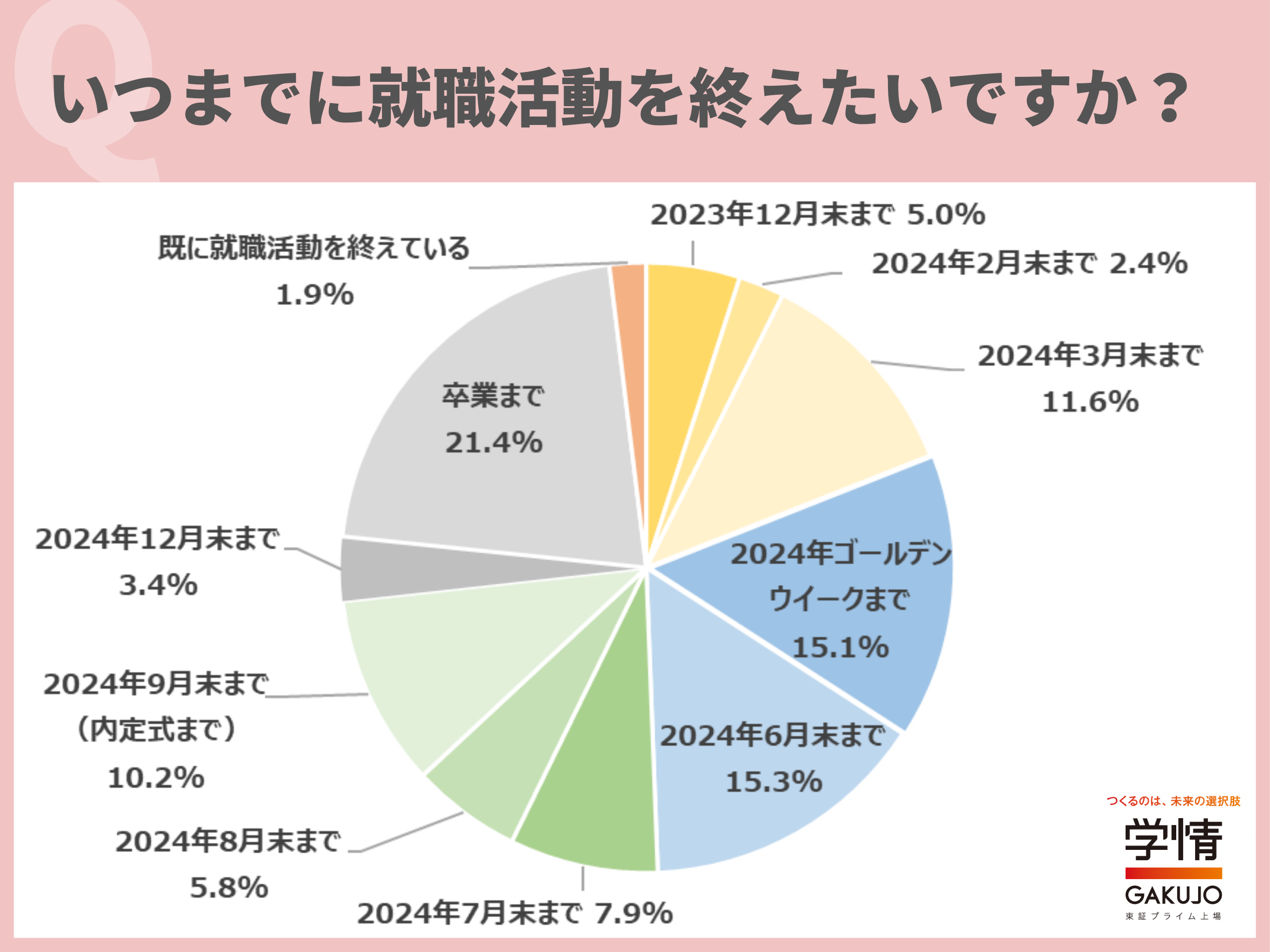 就職活動を終えたい時期は、「卒業まで」を除くと、「2024年6月末まで」が最多。次いで、「ゴールデンウイークまで」15.1%が続きます。4年生の6月末までに就職活動を終えたいとした学生は約半数に迫りました。「2023年12月末まで」5.0%、「2024年2月末まで」2.4%、「2024年3月末まで」11.6%となっており、5人に1人は、3年生のうちに就職活動を終えたいとしています。また1.9%の学生が、「既に就職活動を終えている」と回答しました。「できるだけ早く就職活動を終えて、残りの学生生活は学生でないとできないことを経験したい」「3年生のうちに就職活動を終えて、資格の勉強など社会人になる準備のステップに移りたい」「多くの企業の選考が集中する4年生の6月末までには就職活動を終えたい」「明確にいつまでに終えたいという希望はないが、希望する企業から内定を得られたら就職活動を終えたい」などの声が上がりました。