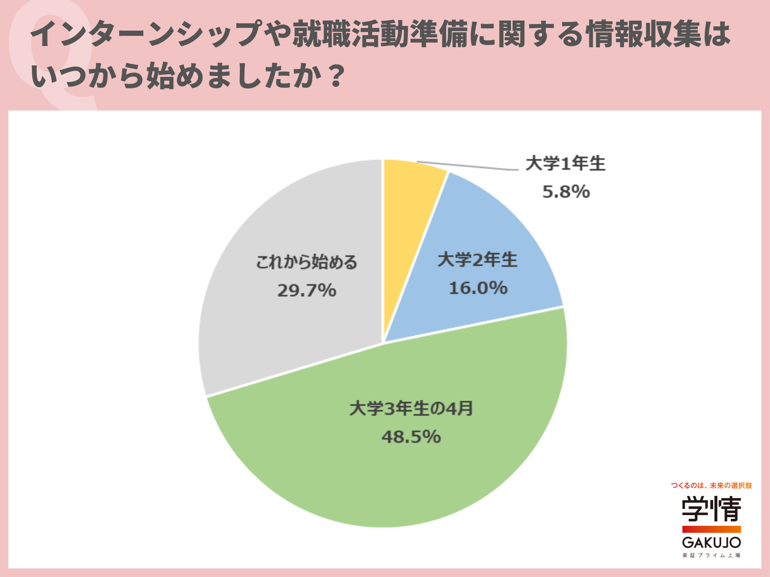 インターンシップや就職活動準備に関する情報収集を始めた時期は、「大学3年生の4月」が48.5%で最多となりました。「大学2年生」16.0%、「大学1年生」5.8%となっており、5人に1人は3年生になる前に、インターンシップや就職活動準備に関する情報収集を始めていたことが分かります。