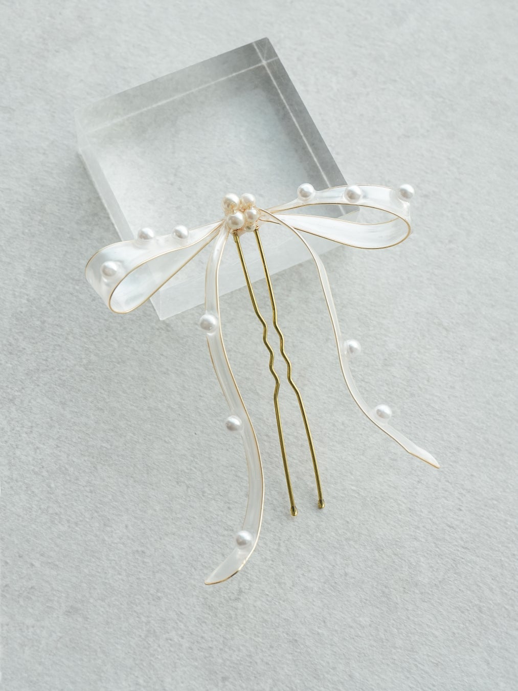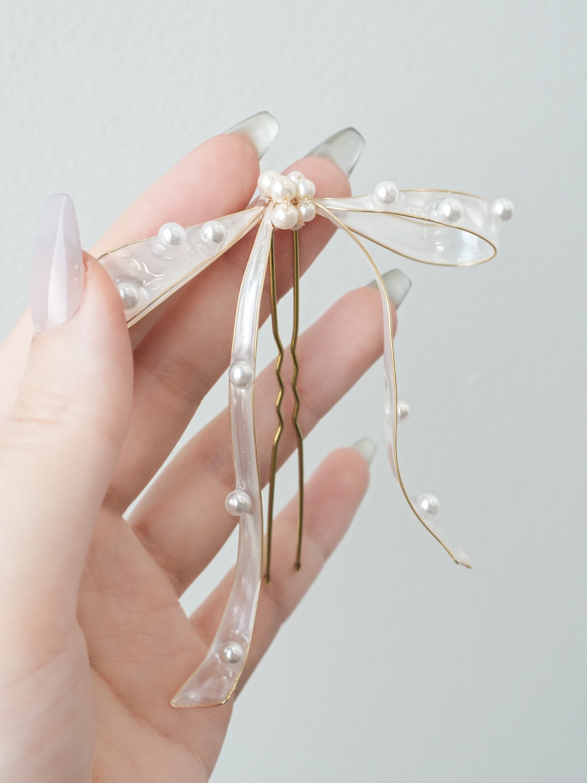 ワイヤーで作った大きなリボンは、一つとして同じ形はない特別な髪飾り。柔らかな動きのあるリボンに、パールを散りばめて可愛らしさをプラスしました。