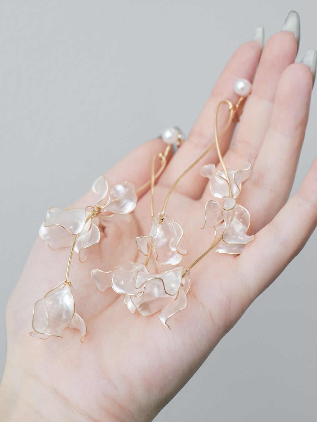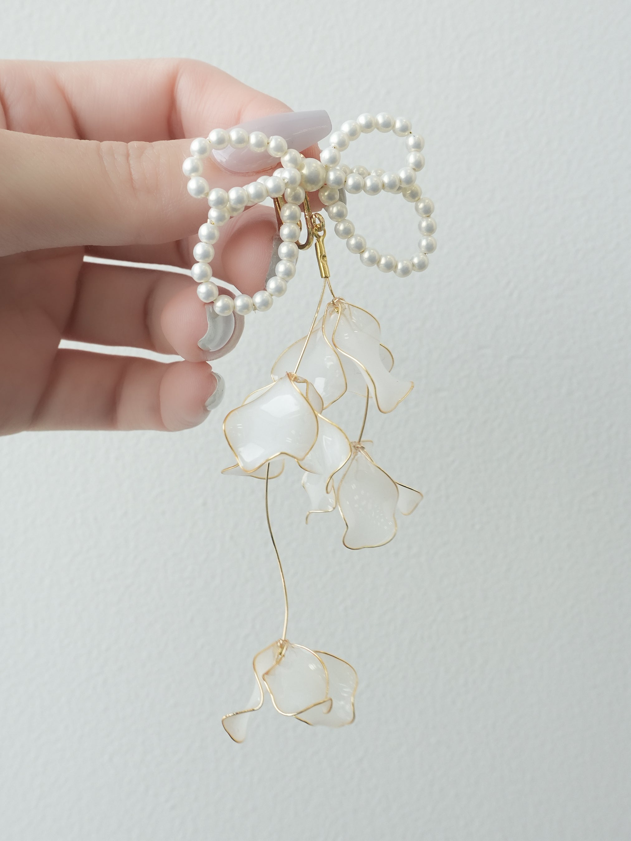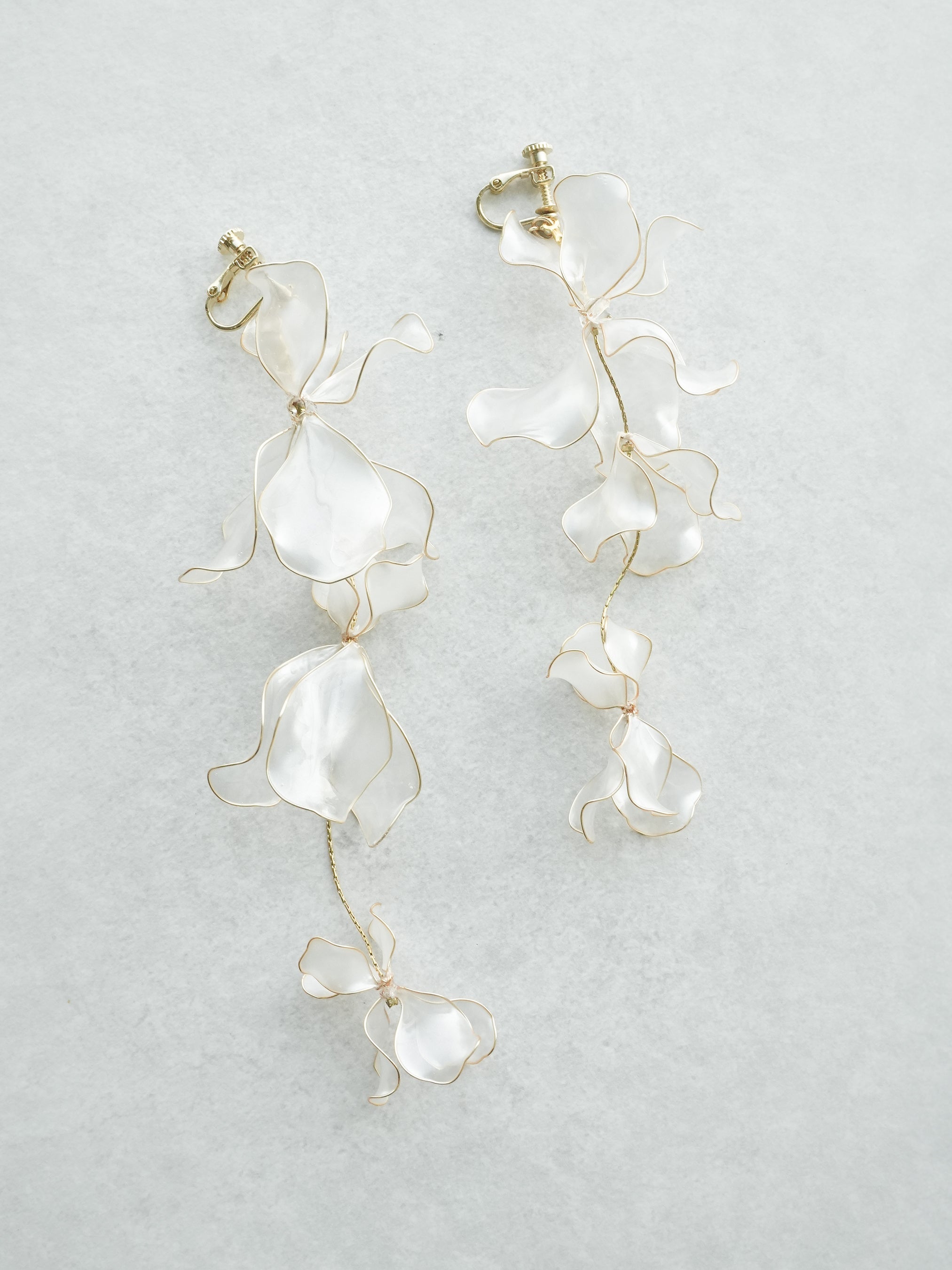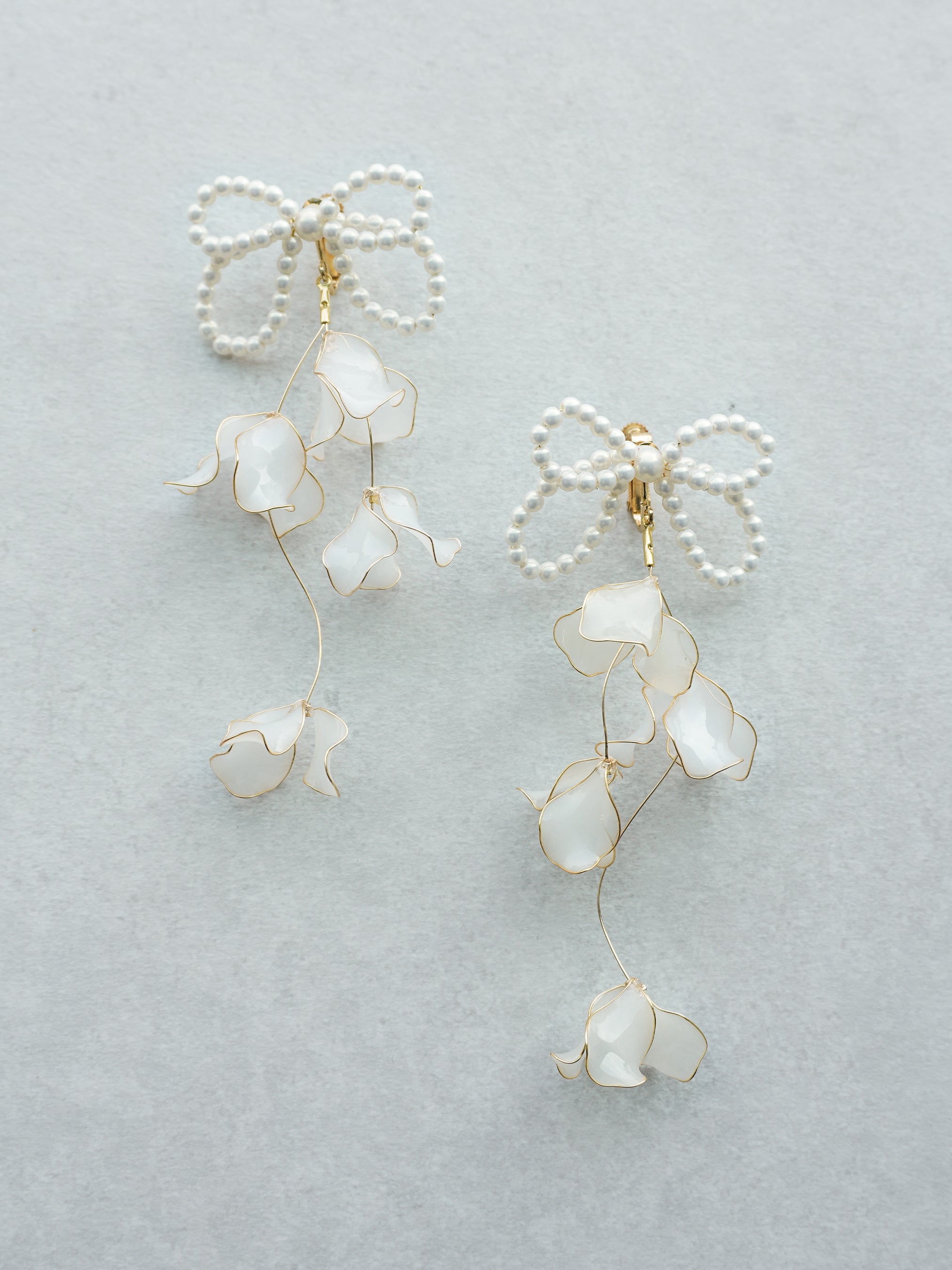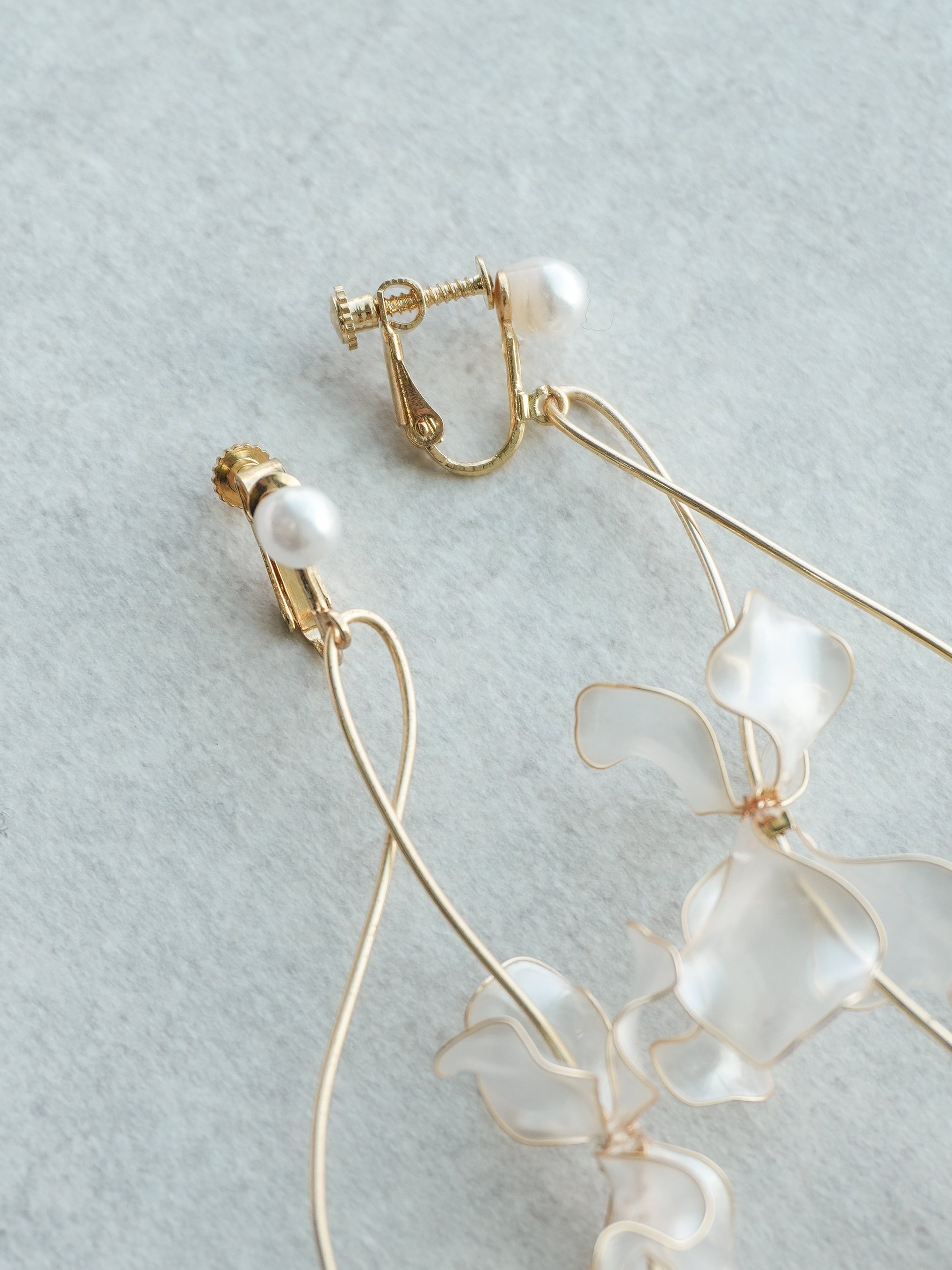半透明パールカラーの花びらをたっぷりと使い、透明感あるデザインに仕上げました。お顔周りに艶やかなきらめきを添える耳飾りです。