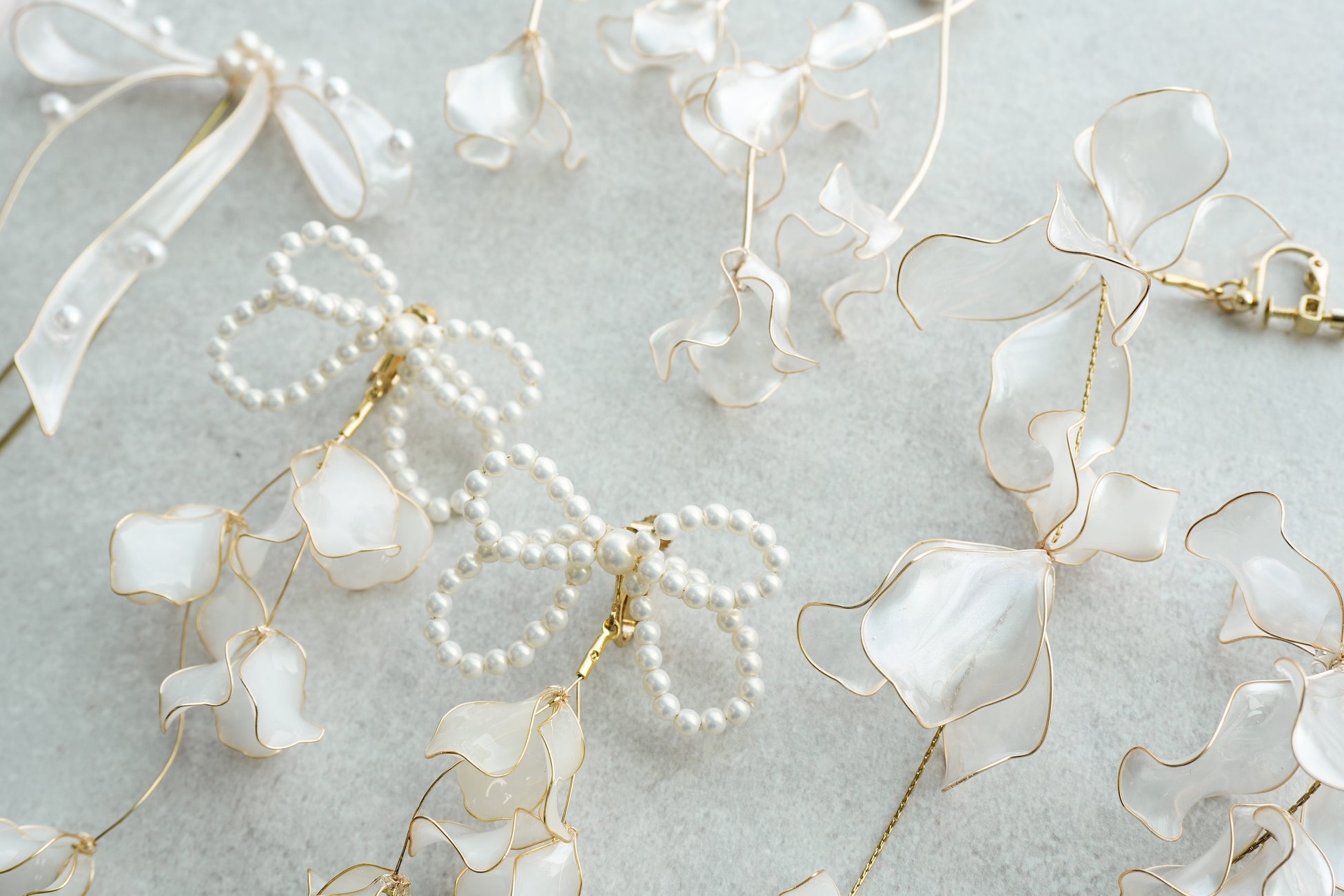 パールのリボンにお花のチャームを合わせて可愛らしい雰囲気に仕上げました。柔らかな曲線のワイヤーに花びらを散りばめて、動きのあるデザインにしています。