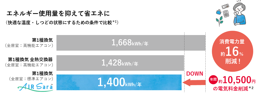 快適な温度・湿度(しつど)の状態にするための条件下でのエネルギー消費量は、第3種換気比で約16%削減を実現しました。