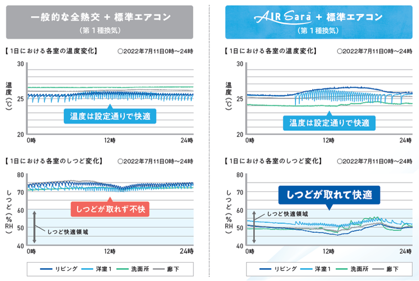 本システムは、除湿した後に温め直す「再熱除湿」も搭載し、梅雨時期など外気温があまり高くない時期でも、部屋の温度を下げ過ぎずにしっかり除湿します。各居室のエアコンが、再熱除湿機能無しの標準エアコンでも、住戸全体をさらっと快適な空間を実現します。