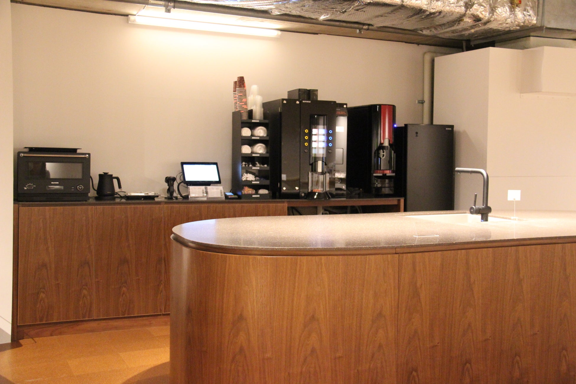 コーヒーマシンやオフィスコンビニを設置。懇親会の利用も想定。