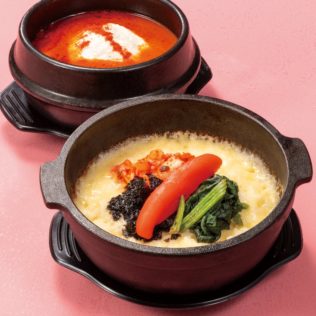 丸々1本のせた明太子の辛みと、まろやかなチーズを熱々の鍋で合わせることで、おこげまで楽しめる「明太チーズ石焼ビビンバ」を、かつお出汁と豚のベースに、自家製タテギとペースト状にした野菜にアサリを加え、豚の旨味とアサリの香り、タテギのコクがほんのり甘く上品な味わいの自家製豆腐と相まって、シンプルに旨味を堪能できるミニスンドゥブと共に1度で味わえるセットに仕立てました。