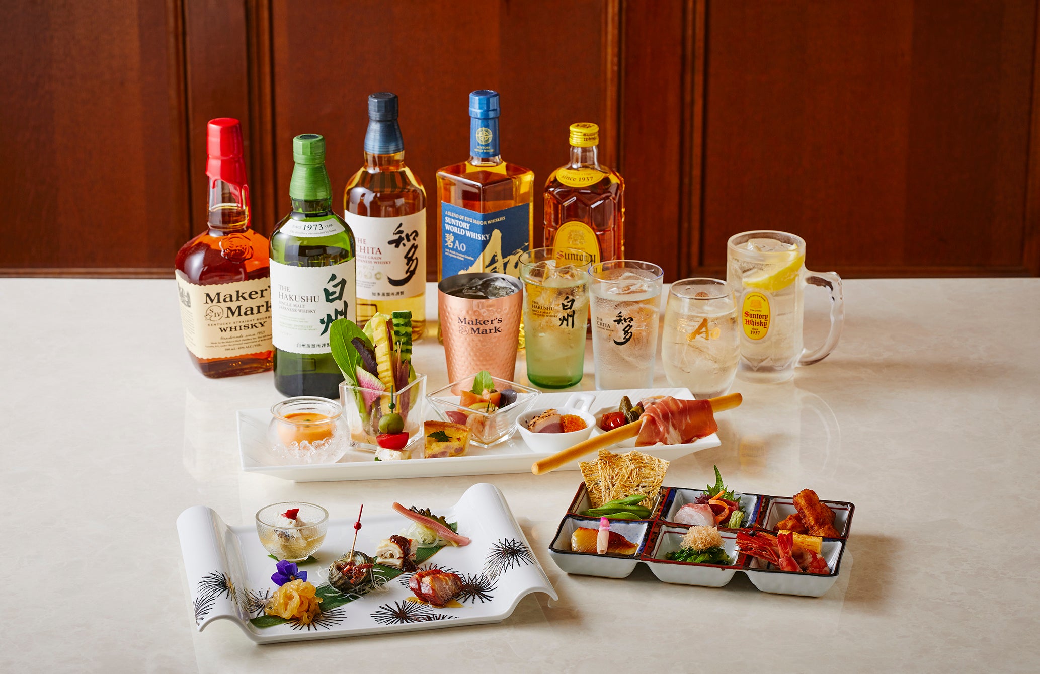 専用グラスで雰囲気も十分にご提供するハイボールは、碧AO、白州、知多、角、メーカーズマークの5種類からお選びいただけます。お造りや銀鱈の西京焼きなど上品な味わいが並ぶ日本料理には、碧AOや白州がおすすめ。彩り豊かな洋食のアミューズパレットには定番の角が、よだれ鶏やXO醤煮など濃厚な味わいの中国料理には知多や碧AOがおすすめです。お好みの前菜とハイボールで楽しい時間をお過ごしください。