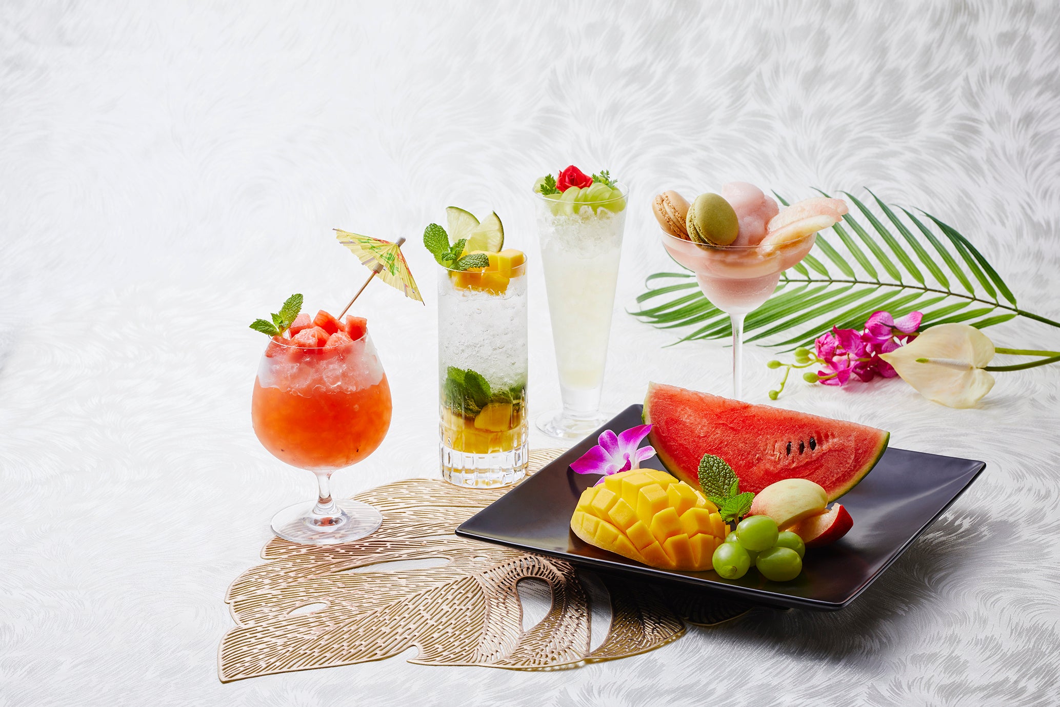 夏に美味しいフルーツを贅沢に使用した創作カクテルが登場。アールグレイが華やかに香る “スイカ&アールグレイカクテル”は、爽やかなジンがスイカの甘みを引き立てるすっきりとした一杯です。清涼感あふれるミントと濃厚な甘みのマンゴーが相性抜群の“常夏マンゴーモヒート”や、マスカットの爽やかな香りとバニラのほんのり甘い香りをご堪能いただける“マスカット&バニラカクテル”、カットした白桃とマカロンをトッピングした食べるカクテル“白桃カクテル”がラインナップ。また、お好みのお酒に合わせてフルーツもお楽しみいただけるよう、フルーツの盛合せもご用意いたしました。