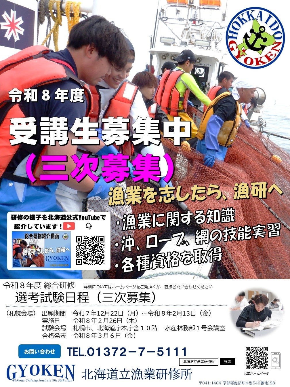 「令和8年度 北海道立漁業研修所 総合研修」受講生の三次募集開始について