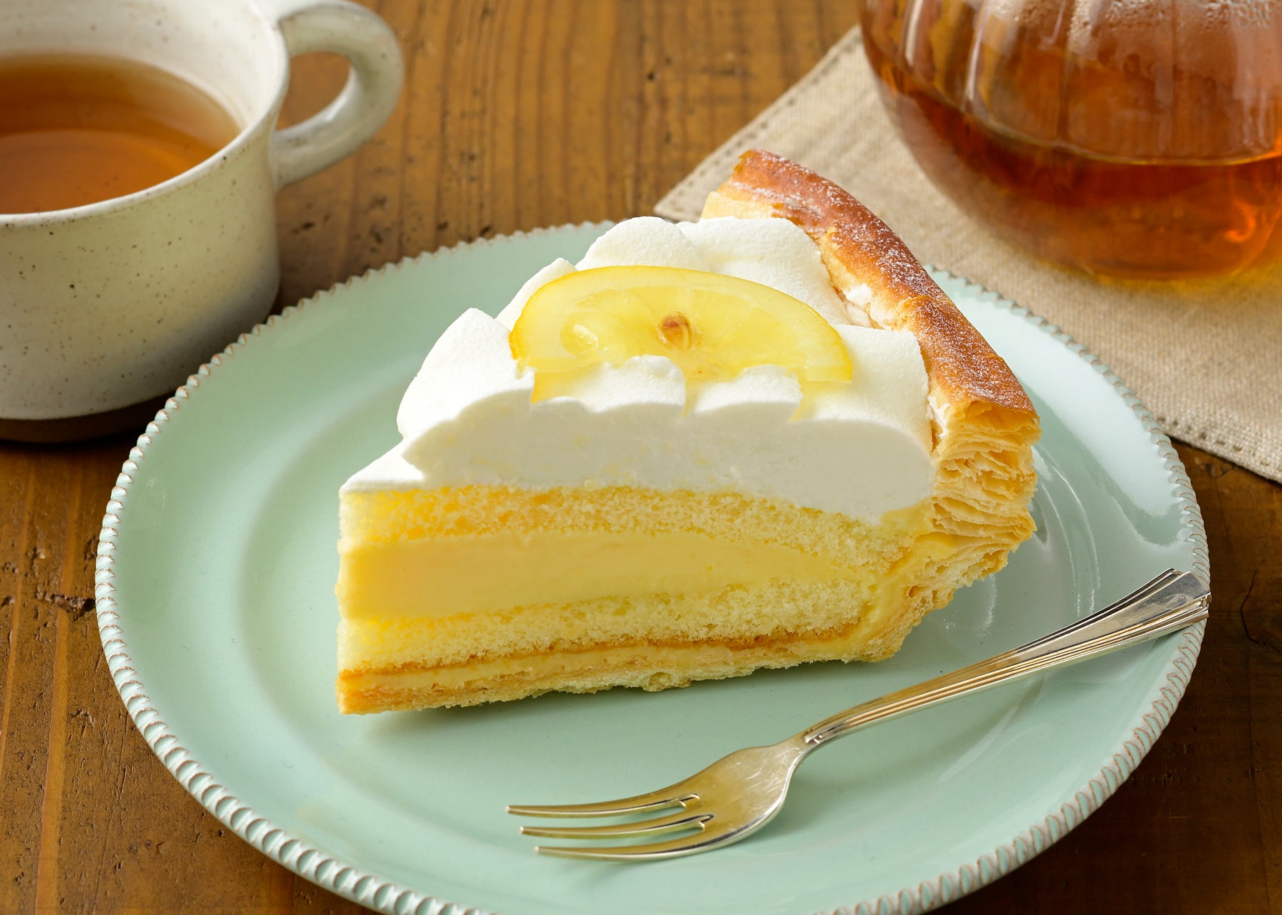 瀬戸内レモンを使用したジャムとゼリー&ピール入りレモンクリームをサンドし、上面にレモンジュレと、瀬戸内レモン(広島県産)のスライスを飾りました。レモンピールの食感と爽やかなほろ苦さがアクセントになり、口いっぱいに瀬戸内レモンの風味が広がります。