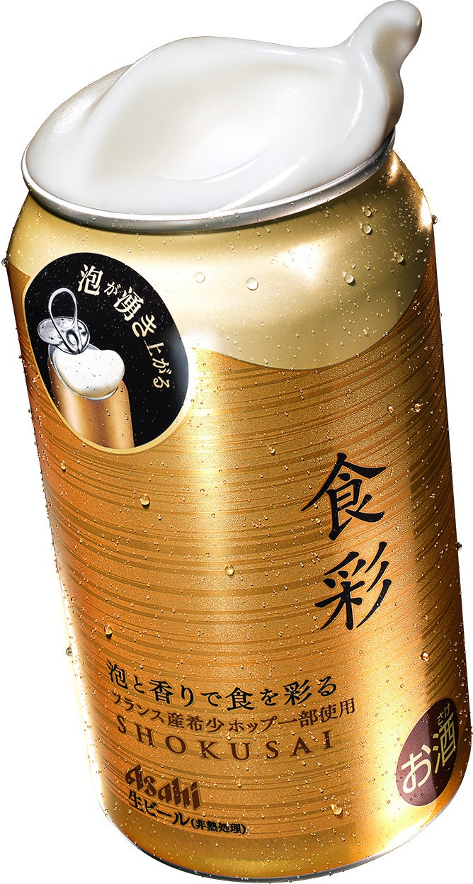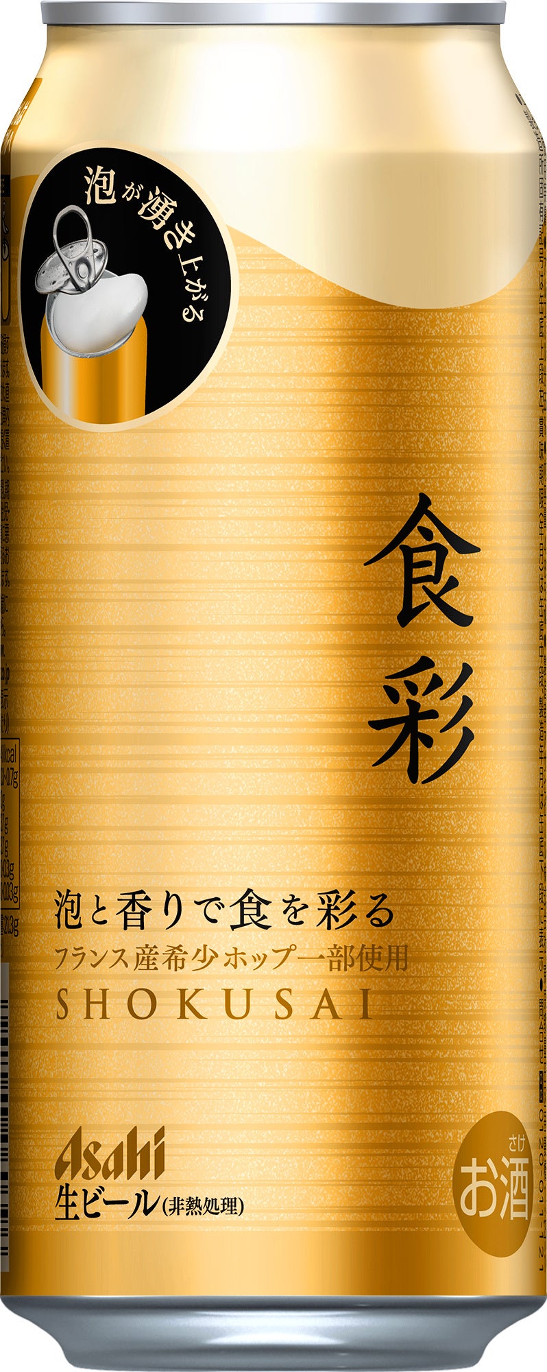 『アサヒ食彩』は、“蓋をあけるだけではじまる優雅なひととき。泡と香りで食を彩るビール”がコンセプトのプレミアムビールです。本商品の特長を最大限感じられるように、開栓するときめ細かい泡が自然発生し飲食店のジョッキで飲む樽生ビールの味わいが楽しめる「生ジョッキ缶」を採用しました。厳選した麦芽とフランス産の希少ホップ「アラミス」を含む5種類のホップを使用し、高い濃度で麦汁を発酵させることで、華やかで豊かな香りと濃厚なコクが楽しめます。
