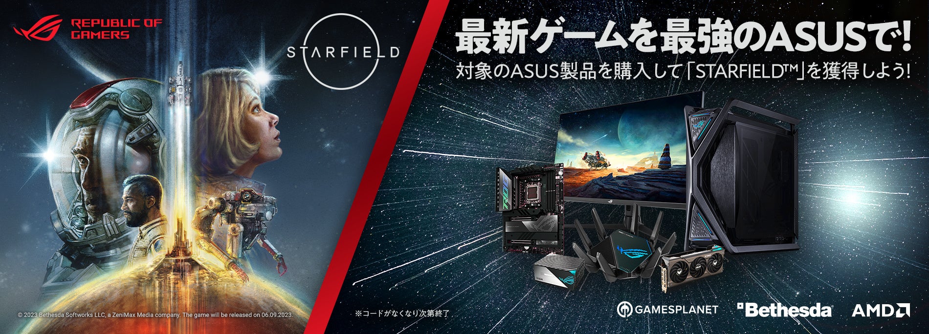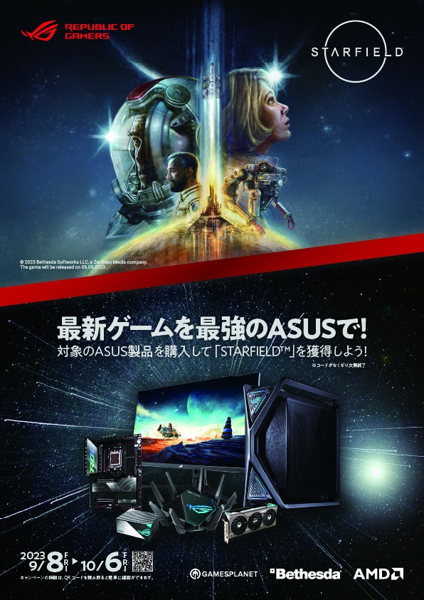 ASUSのマザーボード、ビデオカード、PCケース、電源、モニター、ルーターなどキャンペーン対象の製品を購入して、最新ゲーム「STARFIELD™」をゲットしよう!