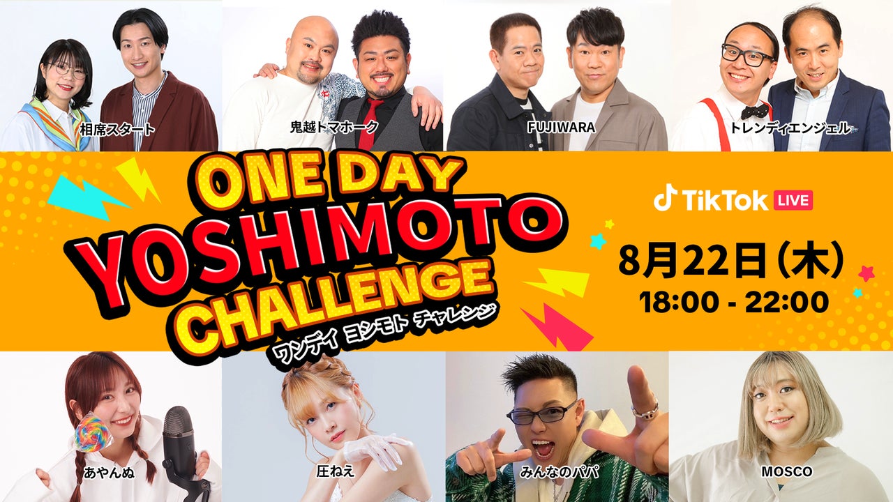 ショートムービープラットフォーム「TikTok(ティックトック)」は、吉本興業の人気お笑い芸人とTikTokクリエイターによるTikTok LIVE公式イベント「ONE DAY YOSHIMOTO CHALLENGE」を、8月22日(木)18時より開催いたします。好評につき、今回が6回目の開催となります。