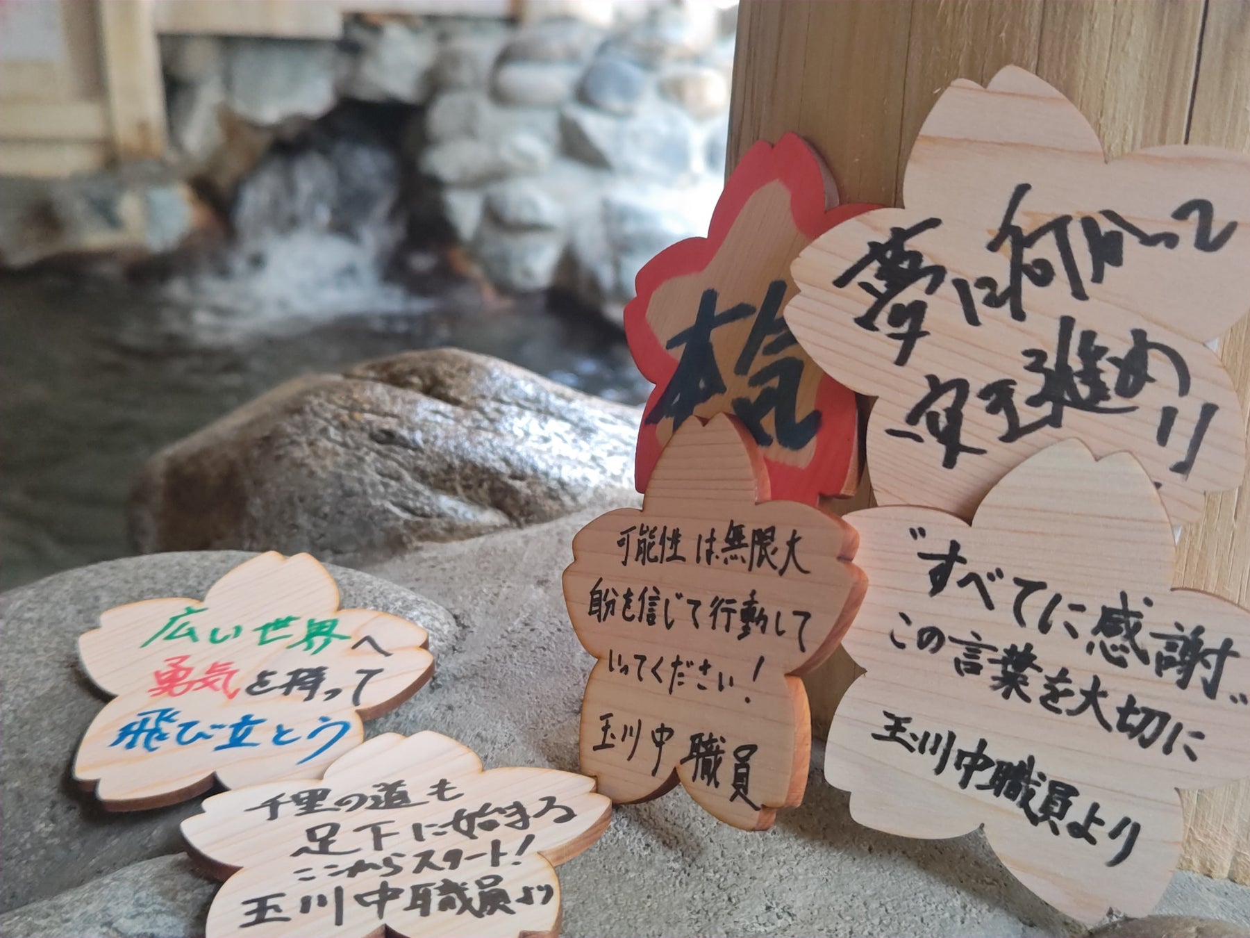 玉川温泉では4月6日まで「感謝の卒業ありがとう風呂」を開催中です。このイベントは、地元中学校卒業生から地域の方に向けた感謝のメッセージをヒノキ入浴木に書いてもらいお風呂に浮かべるものです。卒業生たちは、4月7日から町外の高校に進学し、新しい環境にチャレンジします。新生活が始まる卒業生たちに、母校の中学校教職員の方と玉川温泉を利用する地域の方から、エールを届けたいという想いから「新生活応援 サクラのヒノキ風呂」を実施します。