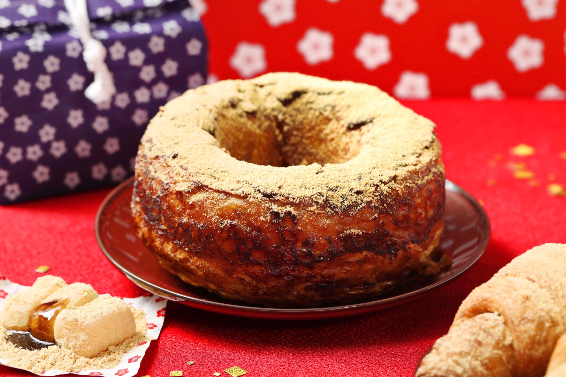 こだわり:サクっとした食感の黒糖風味のデニッシュ生地に、わらび餅と焦がしきな粉ペースト、ホワ