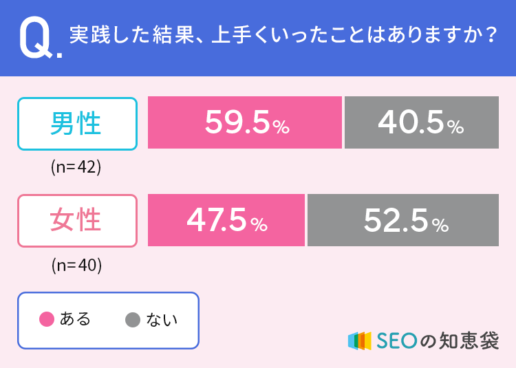 男性の59.5%、女性の47.5%が「実践した結果、上手くいったことがある」と回答しています。