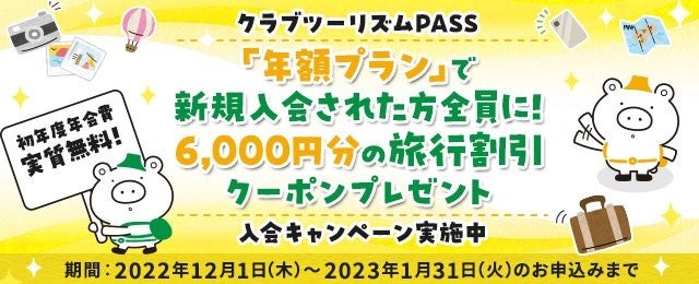 ■内容: 「年額プラン」でクラブツーリズムPASSに新規入会された方全員に6,000円分のクラブツーリズムのご旅行に使える旅行割引クーポンをプレゼント。