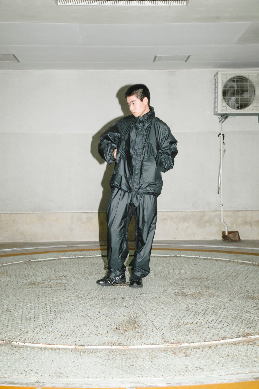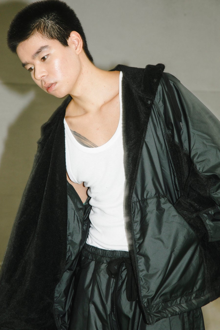 極薄超軽量リサイクルポリエステル(リサイクル率 100%)で摩耗、引き裂きに対応するためリップストップを使用。表⾯の撥⽔加⼯ DWR は C0 撥⽔加⼯(フッ素フリー)により環境へ配慮をしつつ、急な⾬にも対応可能。今回は更にバネのような特性を持たせたヨコ⽷を採⽤しており、ポリエステル 100%でありながら2way ストレッチを実現しました。